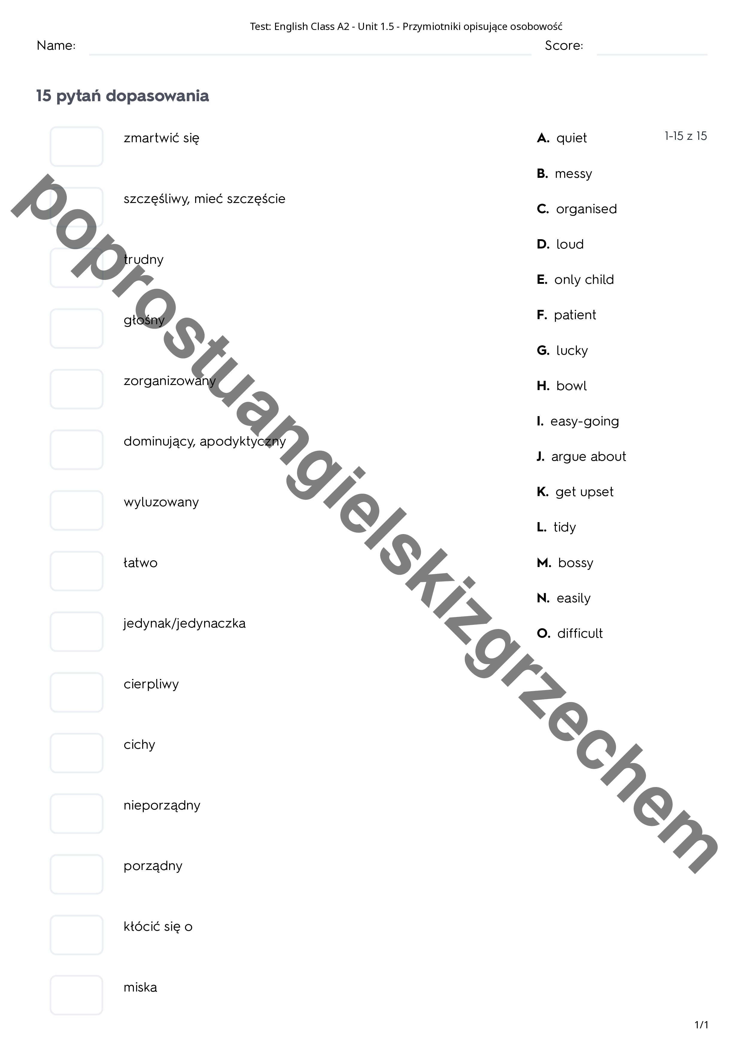 Zestaw zawiera 46 słówek z działu pierwszego do podręcznika English Class A2. Testy podzielone są na 4 podrozdziały, a każdy z nich na 4 kategorie zadań (prawda/fałsz, dopasuj, wielokrotny wybór, pisemny)