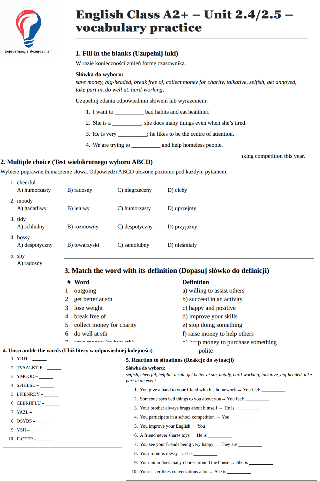 Pięć zadań na słownictwo do działu 2.4 i 2.5 z podręcznika English Class A2+. Całe słownictwo z działu drugiego w postaci testów możesz znaleźć tutaj. Niniejsze zadania możesz wykorzystać do przeprowadzenia powtórki, kartkówki lub do szybkiego utrwalenia materiału ze słownictwa.