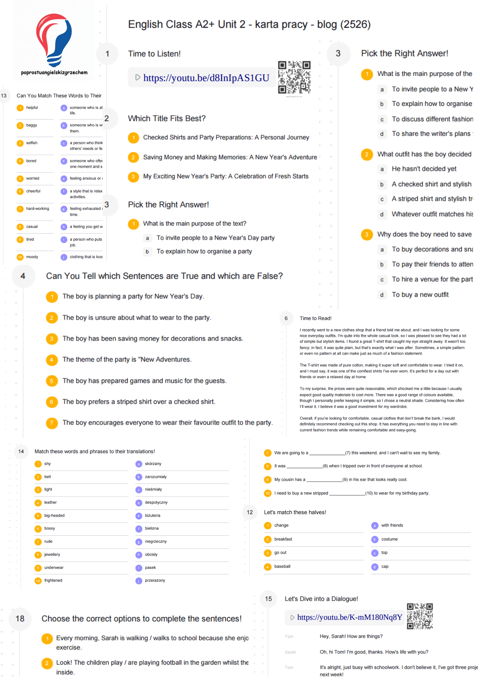 20 zadań zostało opracowanych na podstawie działu drugiego z podręcznika English Class A2+. Słownictwo z tego działu w postaci testów możesz znaleźć tutaj, a w postaci krzyżówek tutaj. Niniejszą kartę pracy możesz wykorzystać do przeprowadzenia całej lekcji w zakresie słuchania, czytania, konwersacji, słownictwa oraz pisania. Możesz też podzielić lekcję na ćwiczenie każdej z tych umiejętności z osobna, gdyż każde zadanie zostało umieszczone na osobnej stronie.