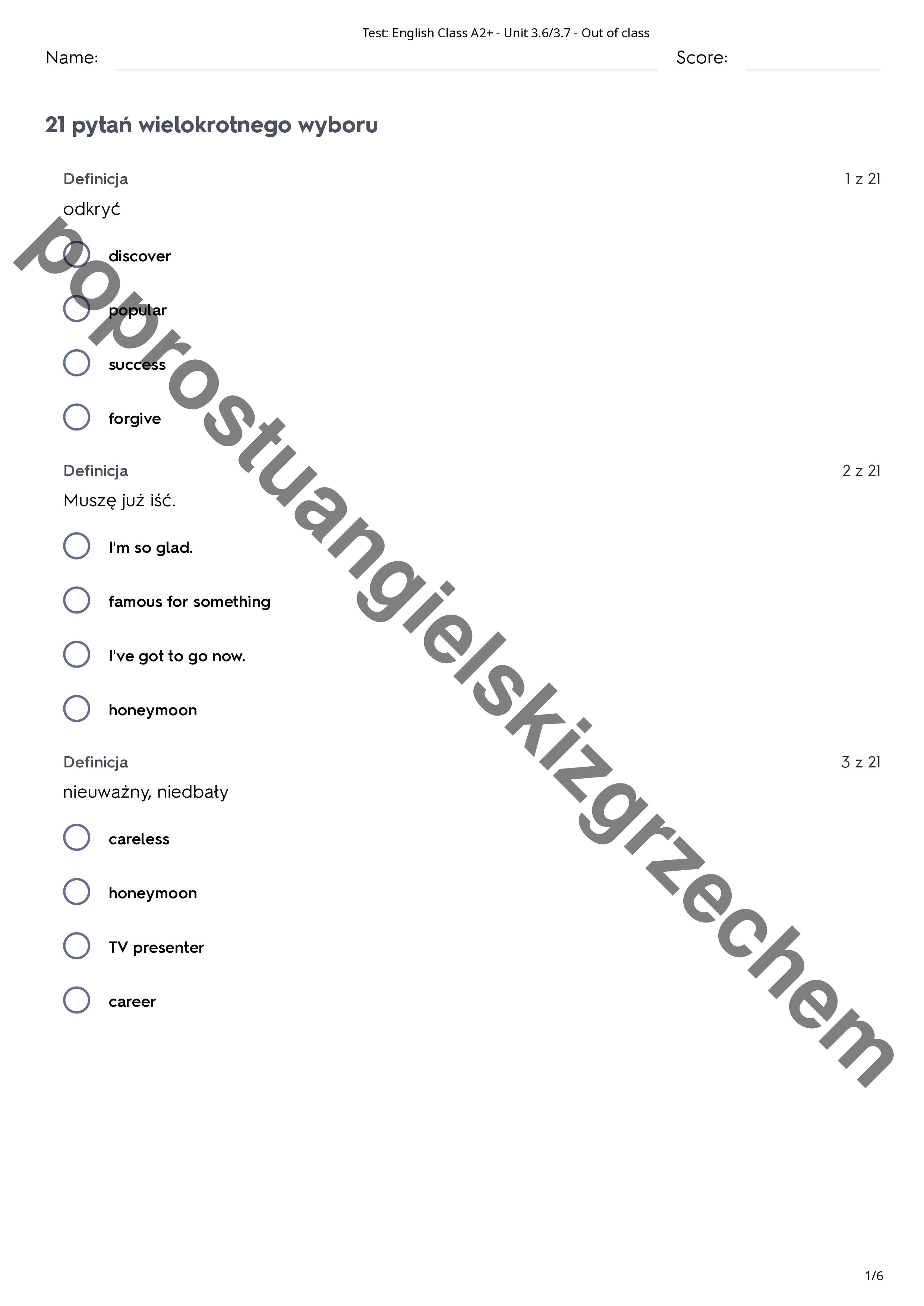 Zestaw zawiera 111 słówek z działu trzeciego do podręcznika English Class A2+. Testy podzielone są na 4 podrozdziały, a każdy z nich na 4 kategorie zadań (prawda/fałsz, dopasuj, wielokrotny wybór, pisemny)