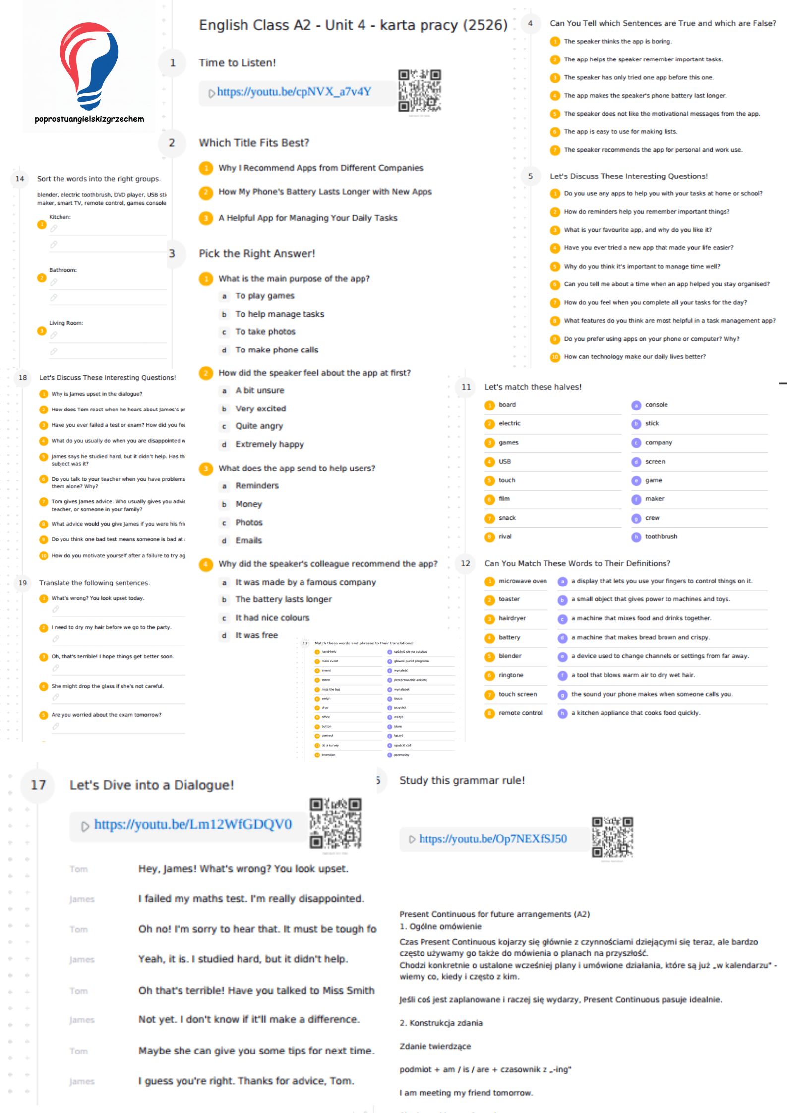 Masz czasem tak, że lekcja za 10 minut, kawa stygnie, a Ty dalej kombinujesz: „jak to dziś sensownie ogarnąć?” ☕😅 Ten zestaw powstał dokładnie po to, żeby zdjąć Ci to z głowy. Co znajdziesz w środku? 👇 📄 20 gotowych zadań na poziomie A2 – listening, reading, grammar, vocabulary, speaking i writing 🎧 3 słuchanki (MP3) + te same nagrania wrzucone na YouTube 🔗 Linki i kody QR bezpośrednio w karcie pracy – zero szukania, zero stresu 📺 Link + QR do filmiku na YT z jasnym wyjaśnieniem gramatyki (Grammar Rules – Present Continuous for future) 🖨️ Minimalistyczny design – idealny do druku, czysty i czytelny 📑 Druga wersja karty pracy – zadania na osobnych stronach 🖼️ Obrazki tematyczne do słuchanek – idealne do ćwiczenia typu “In this picture I can see…” Dlaczego to działa? ✅ Oszczędzasz czas (najcenniejszą walutę nauczyciela) ✅ Masz gotowy plan lekcji, a nie zbiór luźnych ćwiczeń ✅ Uczniowie naprawdę mówią, słuchają i myślą, a nie tylko zaznaczają kratki ✅ Ty skupiasz się na uczniu, nie na kartkach