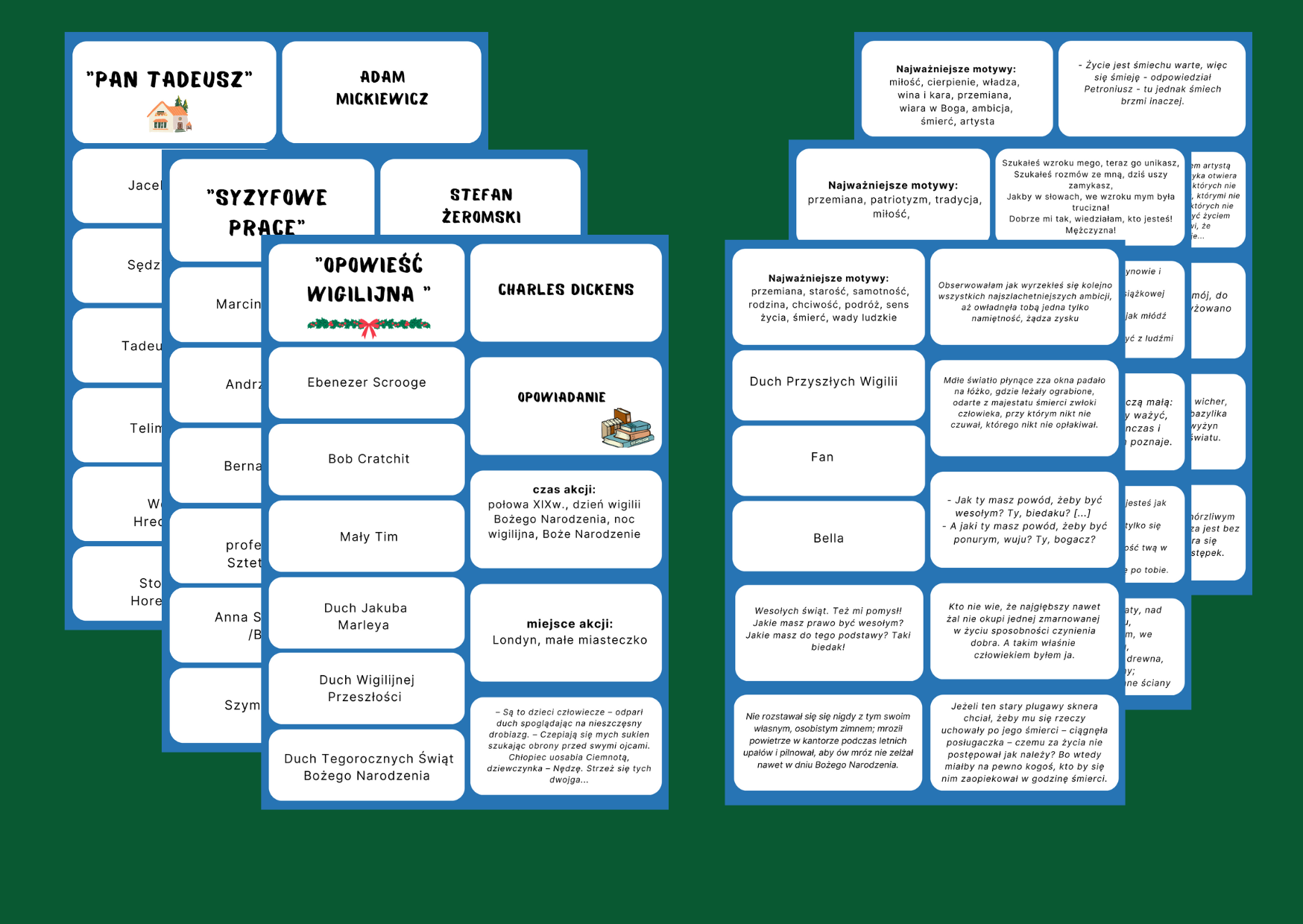 Materiał zawiera 14 stron z fiszkami ( prawie 140 fiszek) dotyczącymi lektur obowiązkowych z klas 7-8, należących do epiki ("Pan Tadeusz", "Quo vadis", "Kamienie na szaniec", "Syzyfowe prace", "Artysta", "Opowieść wigilijna", "Mały Książę", "Latarnik"). Na fiszkach znajdują się: tytuł lektury. autor, bohaterowie, gatunek literacki, czas akcji, miejsce akcji, cytaty.