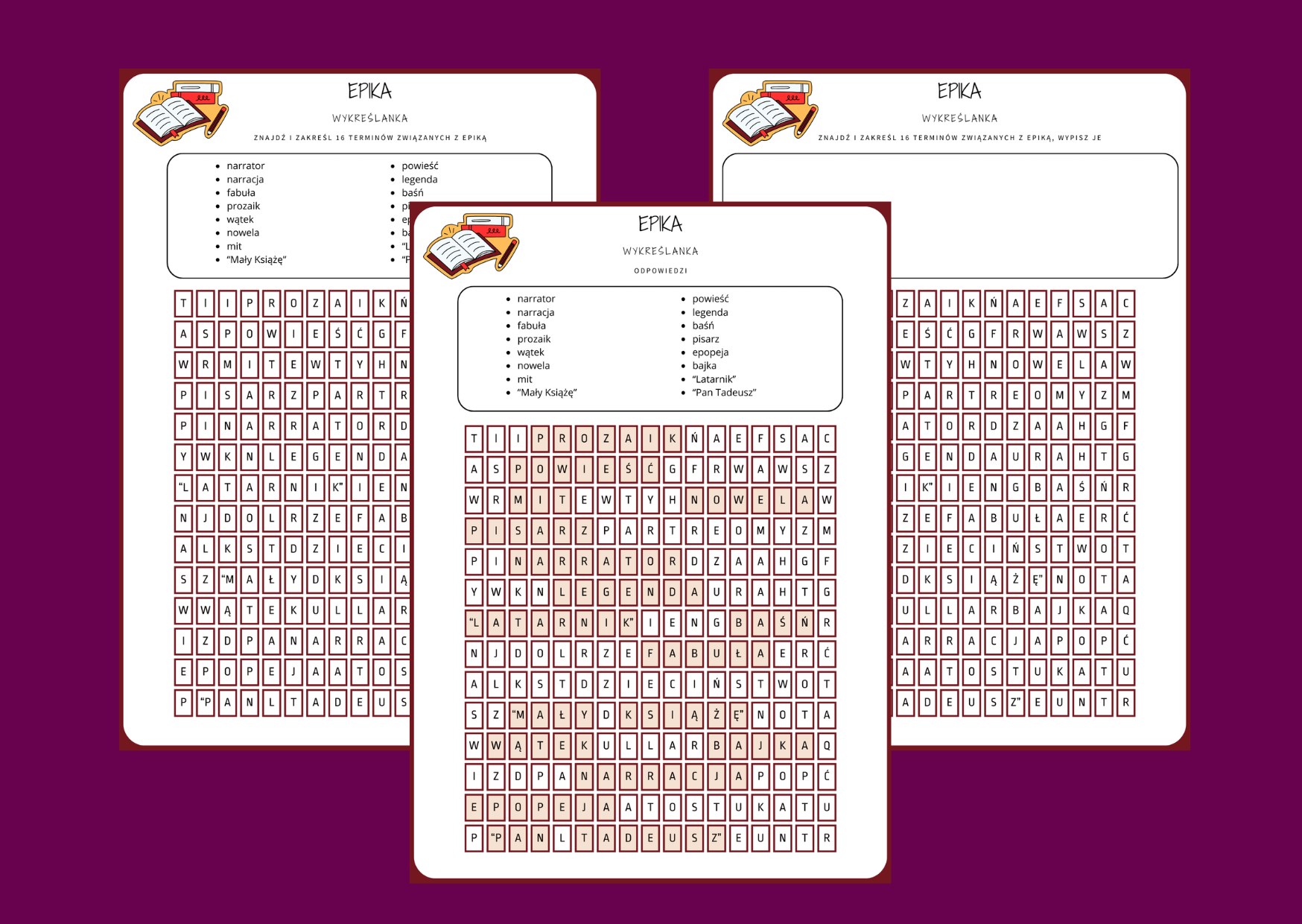 Materiał zawiera wykreślankę dotyczącą epiki (3 wersje: z odpowiedziami, bez odpowiedzi, bez wyrazów do odnalezienia).