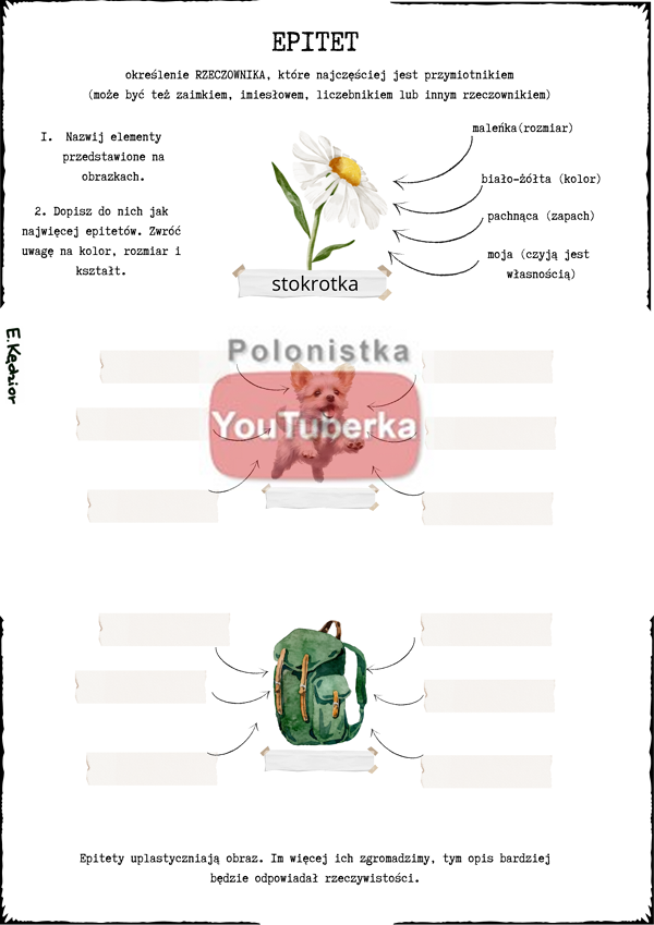 Karta do utrwalenia wiadomości o epitecie. Podobne powstały do uosobienia i ożywienia.