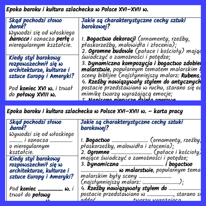 Notatki w formie pytań i odpowiedzi do grupy zagadnień pt. Epoka baroku i kultura szlachecka w Polsce XVI–XVII w., przygotowane dla klasy 6 według podstawy programowej nauczania historii w szkole podstawowej (Podstawa programowa – Historia – Szkoła podstawowa IV-VIII) oraz karta pracy zawierająca luki w treści wymagające uzupełnienia ustnego lub pisemnego.