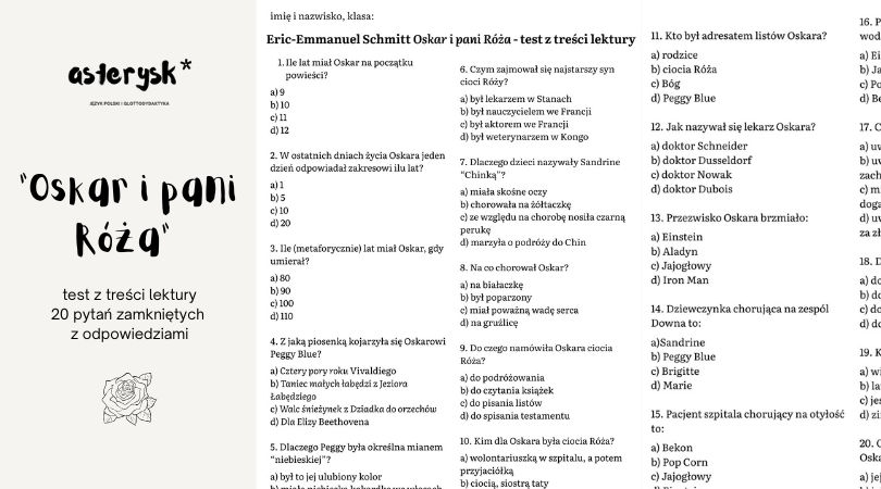 Test sprawdzający znajomość treści lektury "Oskar i pani Róża" Erica-Emmanuela Schmitta. Składa się z dwudziestu pytań zamkniętych.