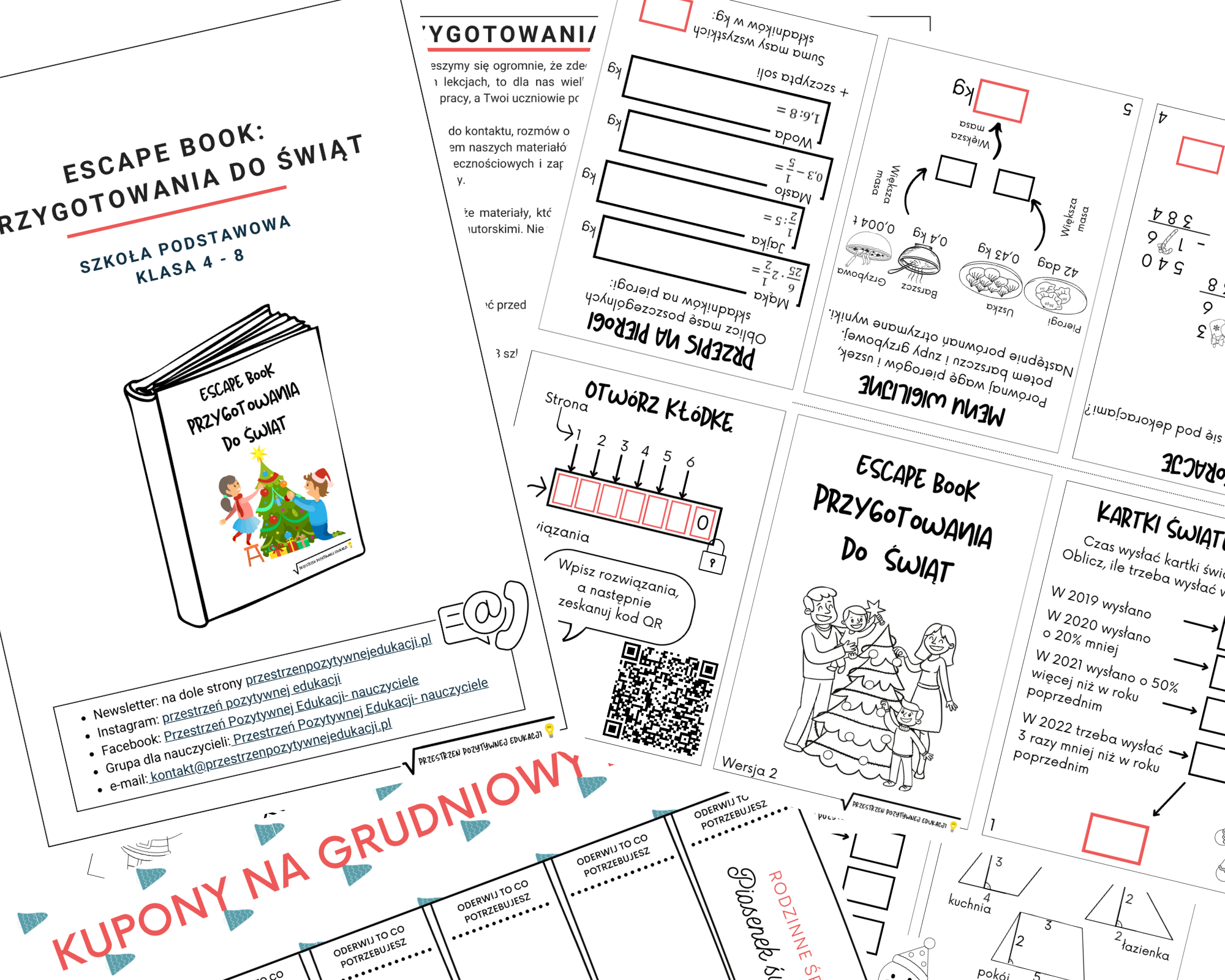 • zadania i zagadki zawarte w escape booku (w dwóch wersjach wiekowych: Wersja 1 dla klas 4-6, Wersja 2 dla klas 6-8; nauczyciel dobiera poziom dla swojej klasy)