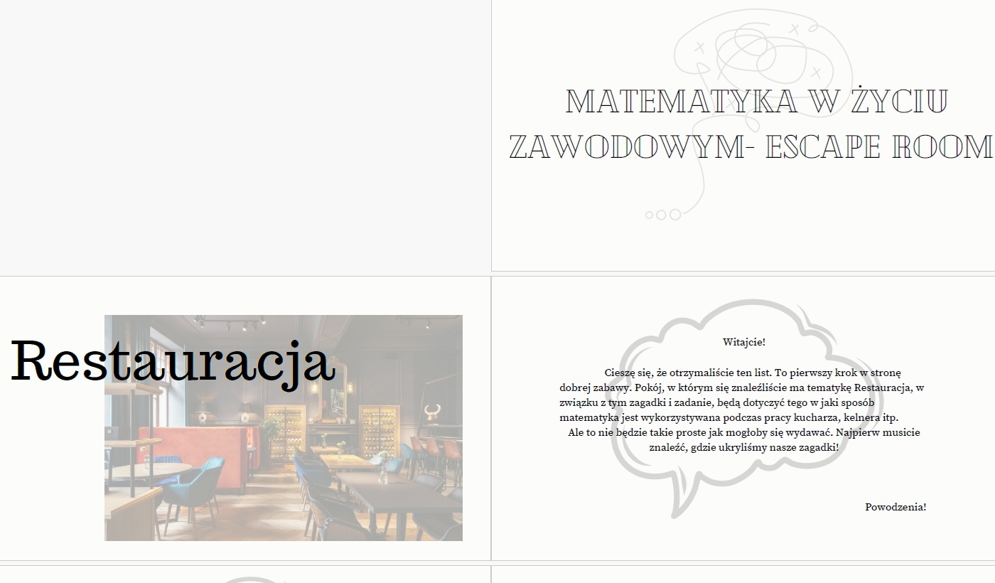 Escape room matematyczny – matematyka w życiu codziennym to angażująca forma lekcji, podczas której uczniowie rozwiązują zadania związane z praktycznym wykorzystaniem matematyki. W trakcie gry uczniowie pracują w grupach, rozwiązując zagadki i łamigłówki dotyczące sytuacji znanych z codziennego życia, takich jak zakupy, obliczenia czasu czy planowanie. Taka forma zajęć rozwija logiczne myślenie, współpracę oraz pokazuje, że matematyka jest obecna w wielu codziennych sytuacjach. Do materiałów dołączony jest również scenariusz lekcji, który ułatwia przeprowadzenie zajęć krok po kroku.