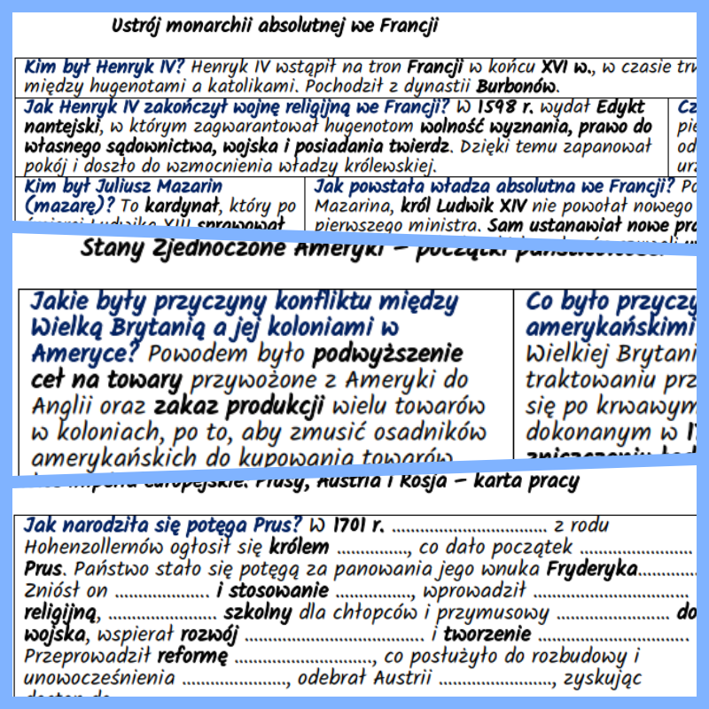 Zestaw notatek w formie pytań i odpowiedzi do zagadnień dotyczących wydarzeń w Europie i Ameryce Północnej w XVII–XVIII w., przygotowany dla klasy 6 według podstawy programowej nauczania historii w szkole podstawowej (Podstawa programowa – Historia – Szkoła podstawowa IV-VIII) oraz komplet kart pracy zawierających luki w treści wymagające uzupełnienia ustnego lub pisemnego. Wyciąg z notatek maturalnych do egzaminu pisemnego i ustnego z historii.