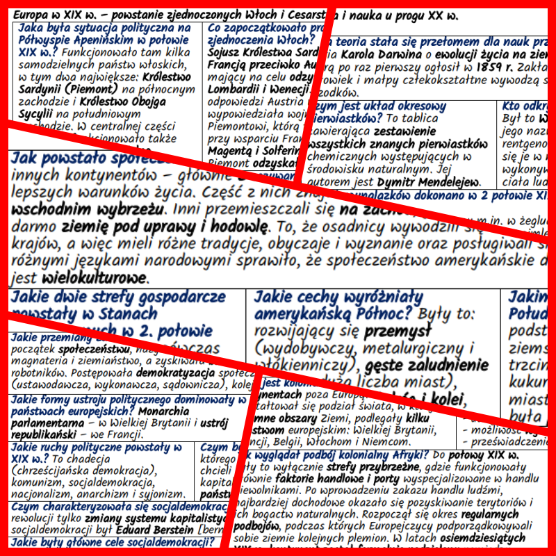 Zestaw notatek w formie pytań i odpowiedzi  w zakresie wiadomości na temat Europy i Świata w 2. połowie XIX w., składający się z opracowań następujących zagadnień: