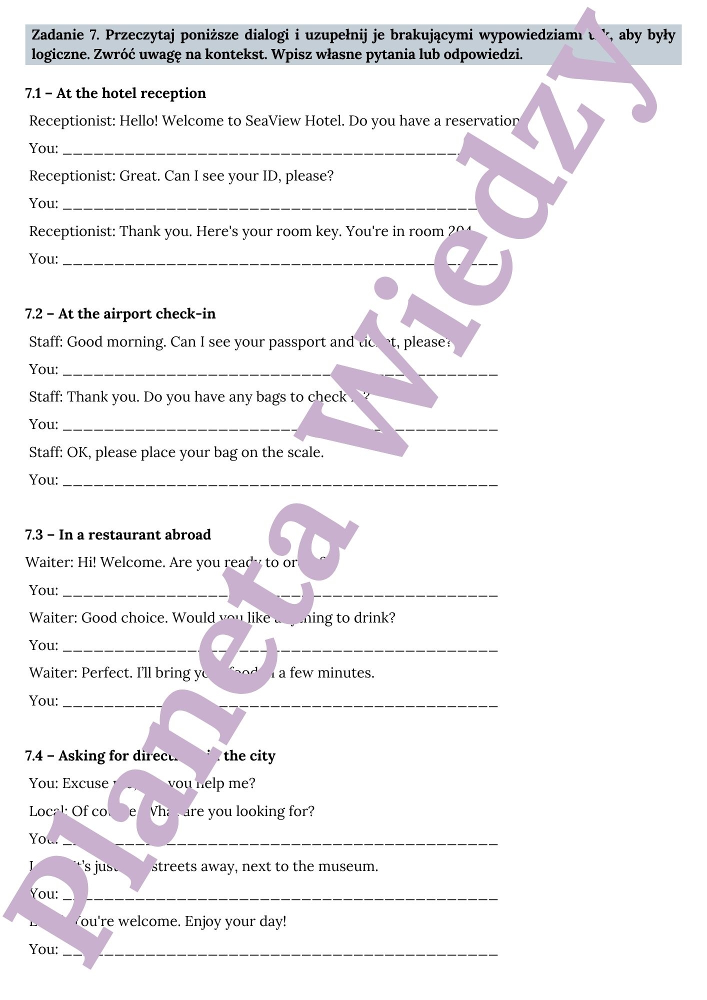 💬 Uzupełnij pytanie lub odpowiedź w dialogu – uczniowie wpisują brakujące zdanie, dbając o spójność i kontekst sytuacyjny.