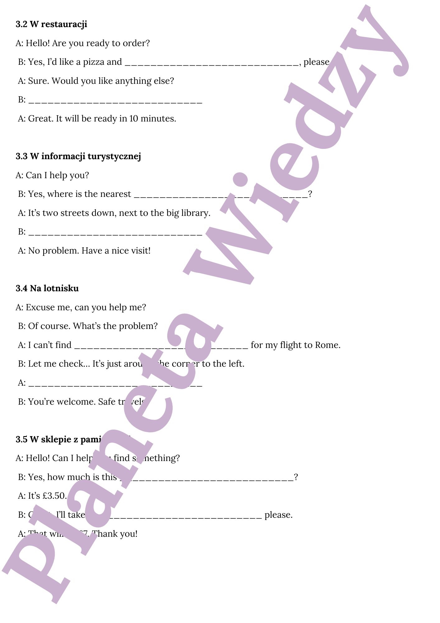 ✍️ Uzupełnij dialogi – zadania z lukami, gdzie uczniowie wpisują brakujące wypowiedzi, ćwicząc logiczne myślenie i słownictwo sytuacyjne.