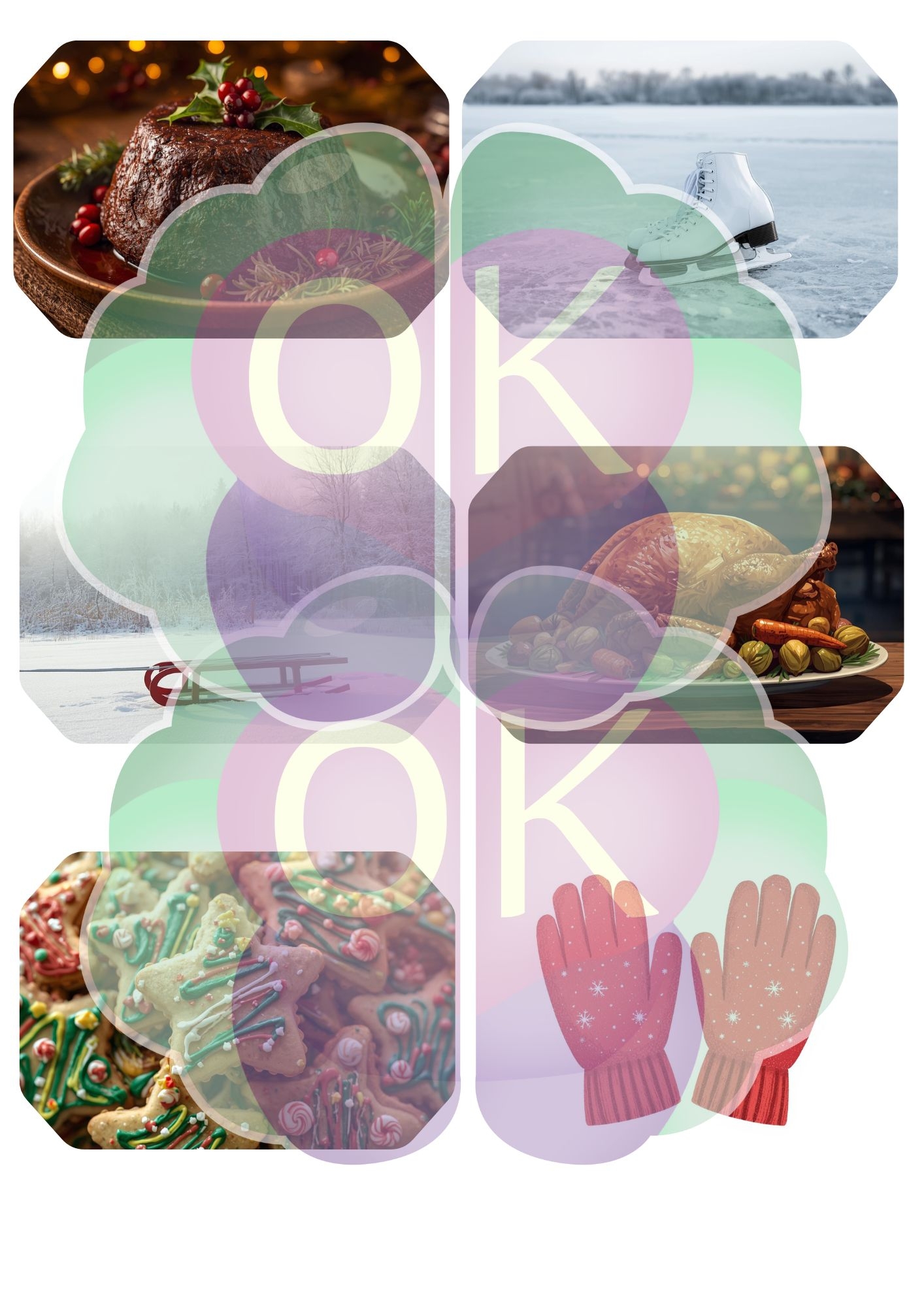 📦 karty obrazkowe – piękne, kolorowe ilustracje o tematyce świątecznej (np. Santa, snowman, reindeer, Christmas tree,...)