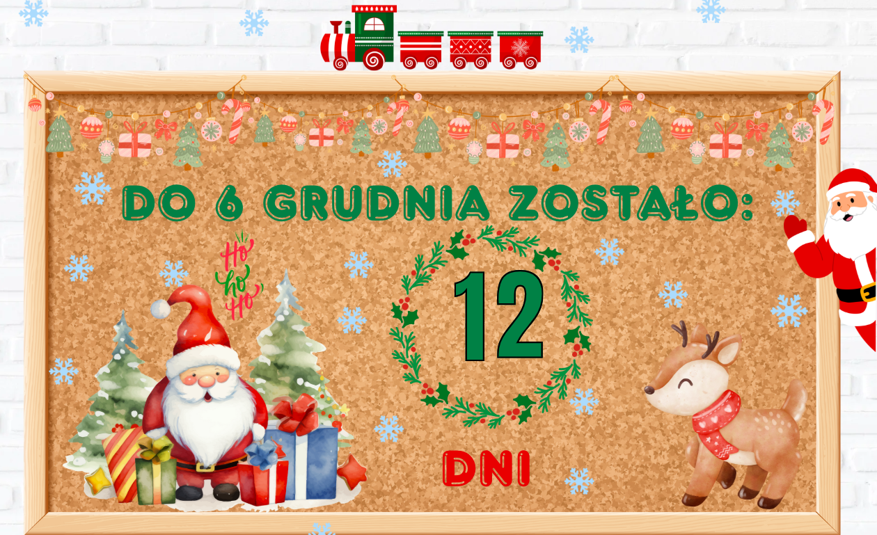 To odliczanie 12 dni do Mikołajek, podczas którego każdego dnia uczniowie odkrywają nową cyfrę (od 12 do 1) i wykonują świąteczne zadanie – od kreatywnych zabaw po kolorowanie i grupowe aktywności.