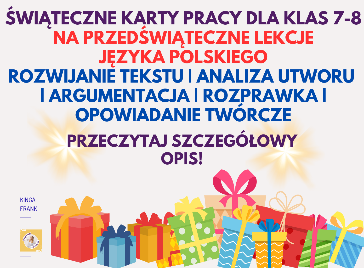 📚 Czym jest ten produkt? To zestaw 5 kart pracy przygotowanych specjalnie na świąteczne lekcje języka polskiego w klasach 7-8! Zadania rozwijają kreatywność, umiejętność pisania i argumentowania, a także pozwalają wprowadzić magiczny nastrój Bożego Narodzenia na zajęciach.