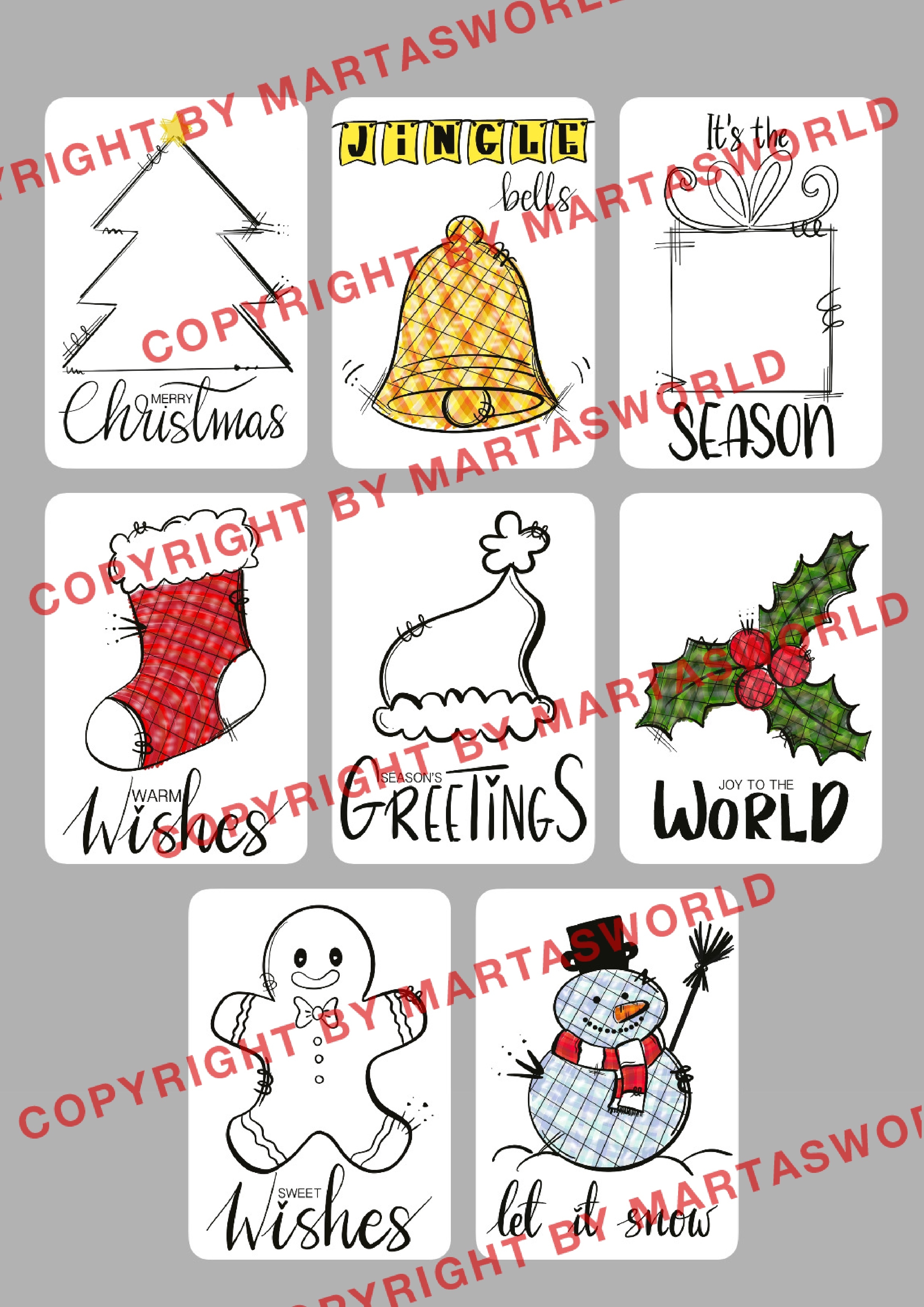 • 14 słów związanych ze świętami (np. Star, Reindeer, Santa Claus, Candy Cane) – każde zilustrowane moimi autorskimi rysunkami.