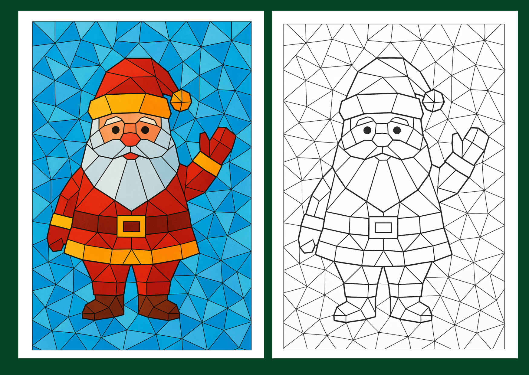 Unikalna kolekcja 30 świątecznych kolorowanek w stylu mozaiki i witrażu, idealna dla dzieci i dorosłych. Każda ilustracja została przygotowana w formacie A4 z wyraźnym konturem i pięknymi geometrycznymi podziałami, które tworzą efekt nowoczesnego witrażu.