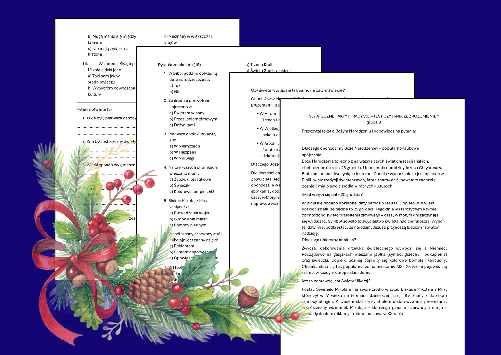 🌟„Świąteczne fakty i tradycje – test dla klas 4–6” to opracowany z myślą o nauczycielach materiał sprawdzający umiejętność czytania ze zrozumieniem oraz poszerzający wiedzę uczniów o ciekawostki dotyczące Bożego Narodzenia. Zestaw opiera się na przystępnym, popularnonaukowym tekście, który wyjaśnia pochodzenie świątecznych zwyczajów, legend i symboli.