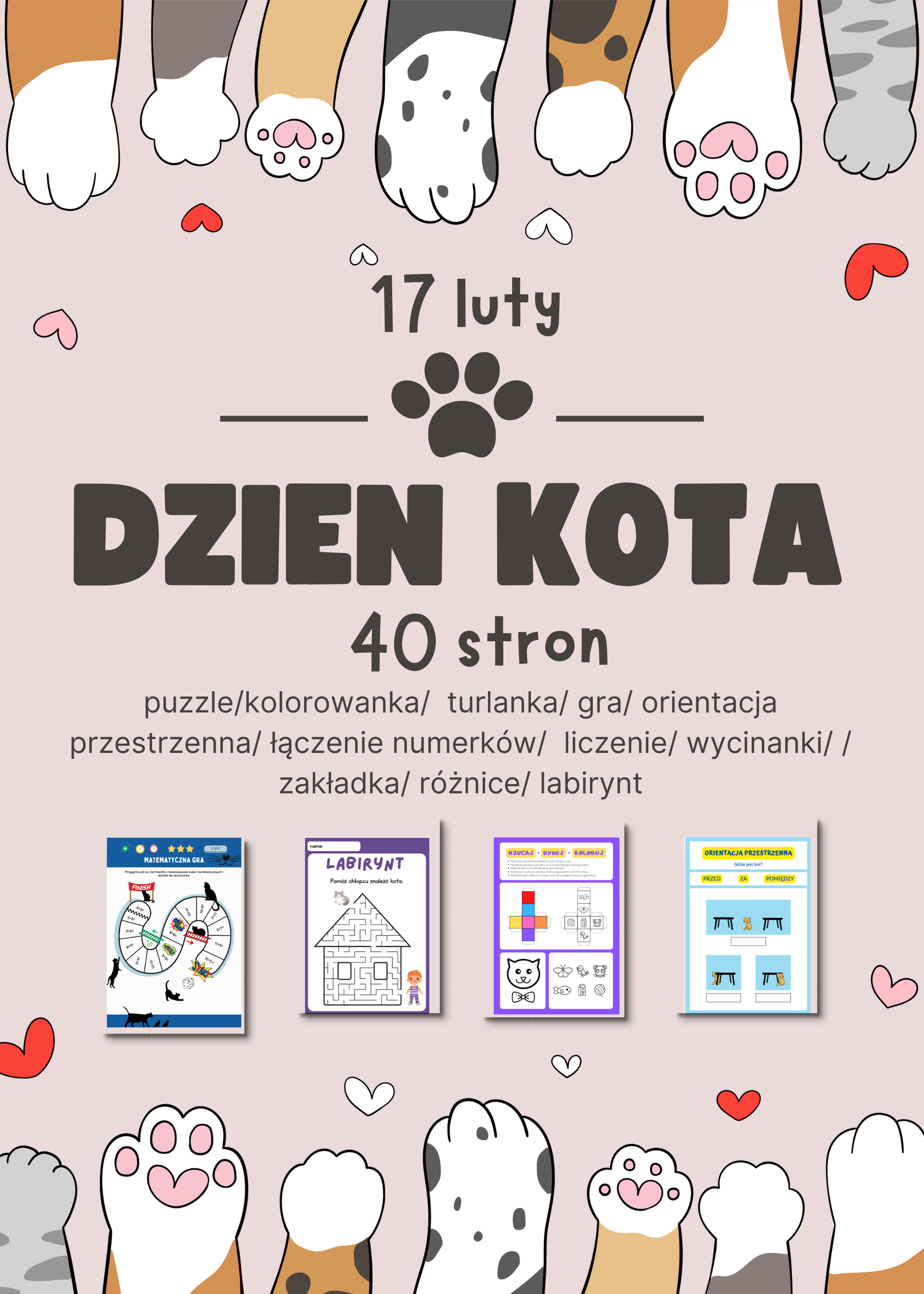 Zestaw „Dzień Kota” to aż 40 stron pełnych zabawy, nauki i kocich motywów! Idealny materiał dydaktyczny do wykorzystania w przedszkolu i szkole podstawowej podczas obchodów 17 lutego – Dnia Kota.