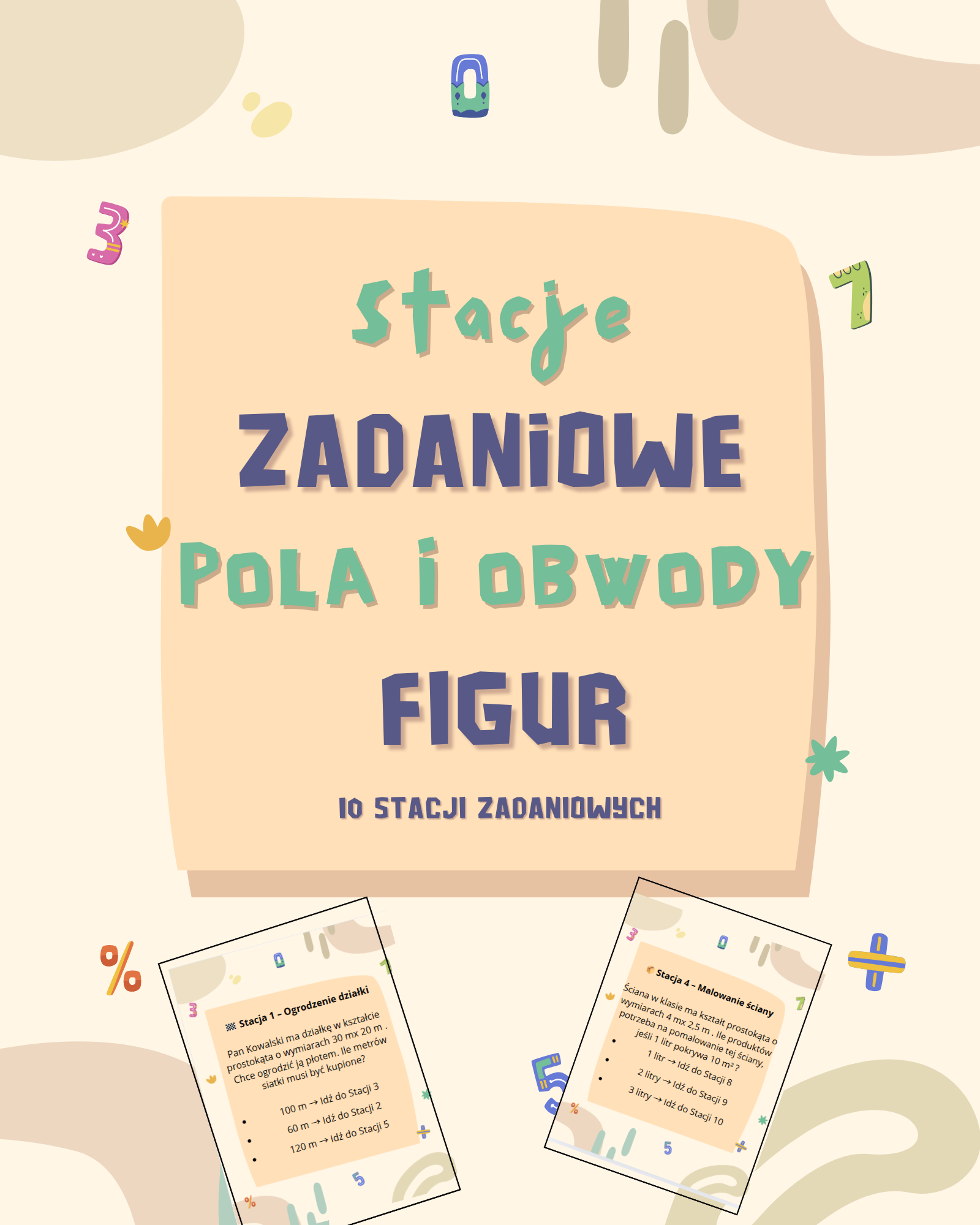 Zestaw został stworzony, by utrwalić i urozmaicić naukę o polach i obwodach figur geometrycznych. Każda stacja to osobne, logiczne wyzwanie — uczniowie rozwiązują zadania krok po kroku, przechodząc dalej zgodnie z wynikami obliczeń.