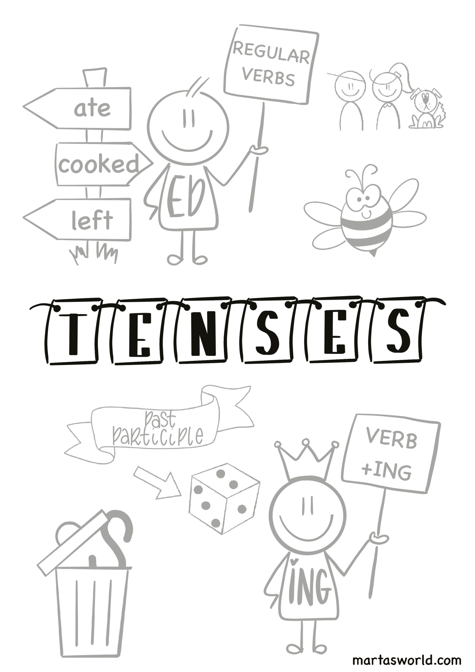 🎨 Rysowane notatki (sketchnotes), które w prosty i atrakcyjny sposób pokazują 12 najczęściej używanych czasów w języku angielskim.