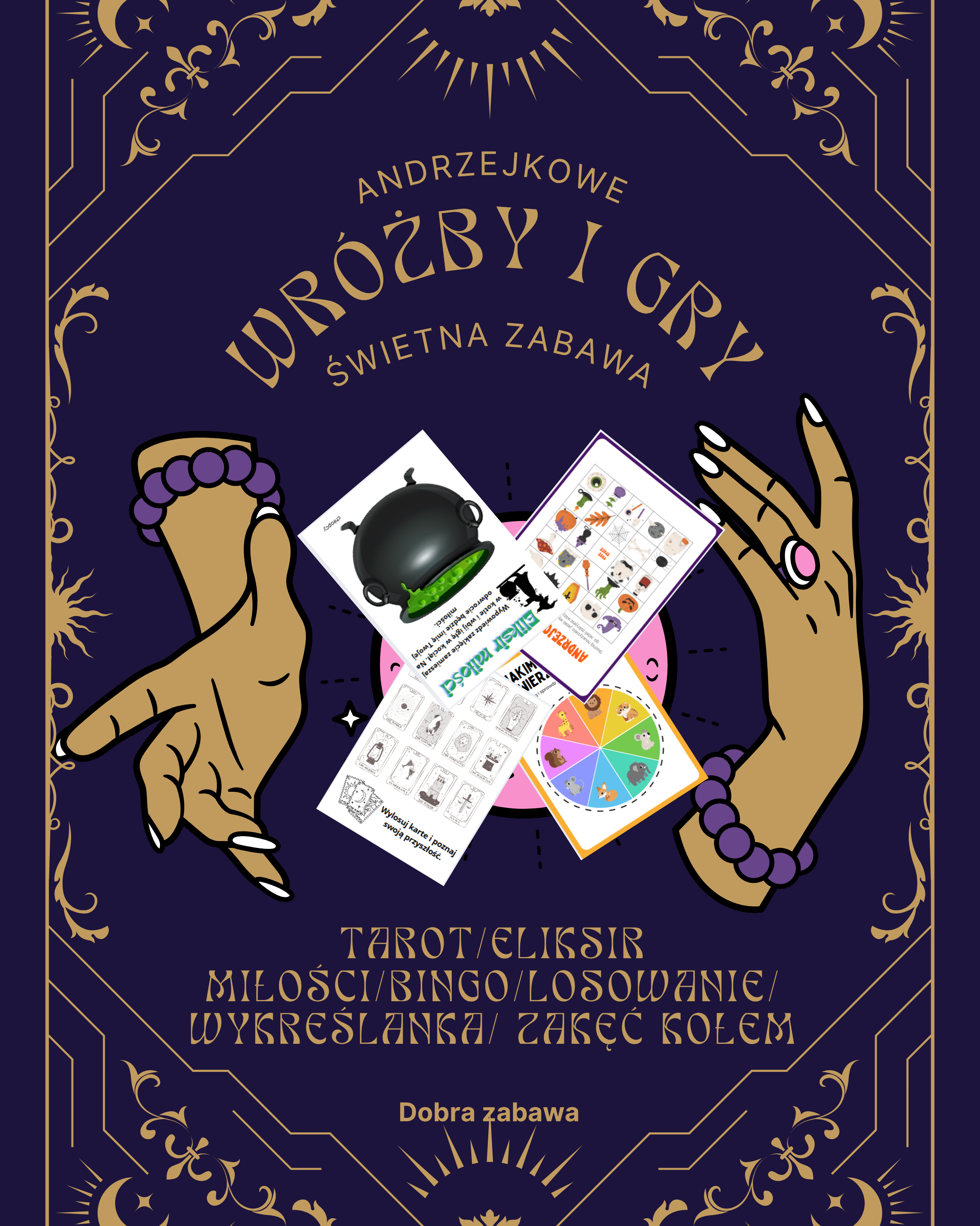 wróżby i zabawy andrzejkowe w różnych formach (tarot, losowanie, eliksiry, koło fortuny, wykreślanki, bingo),