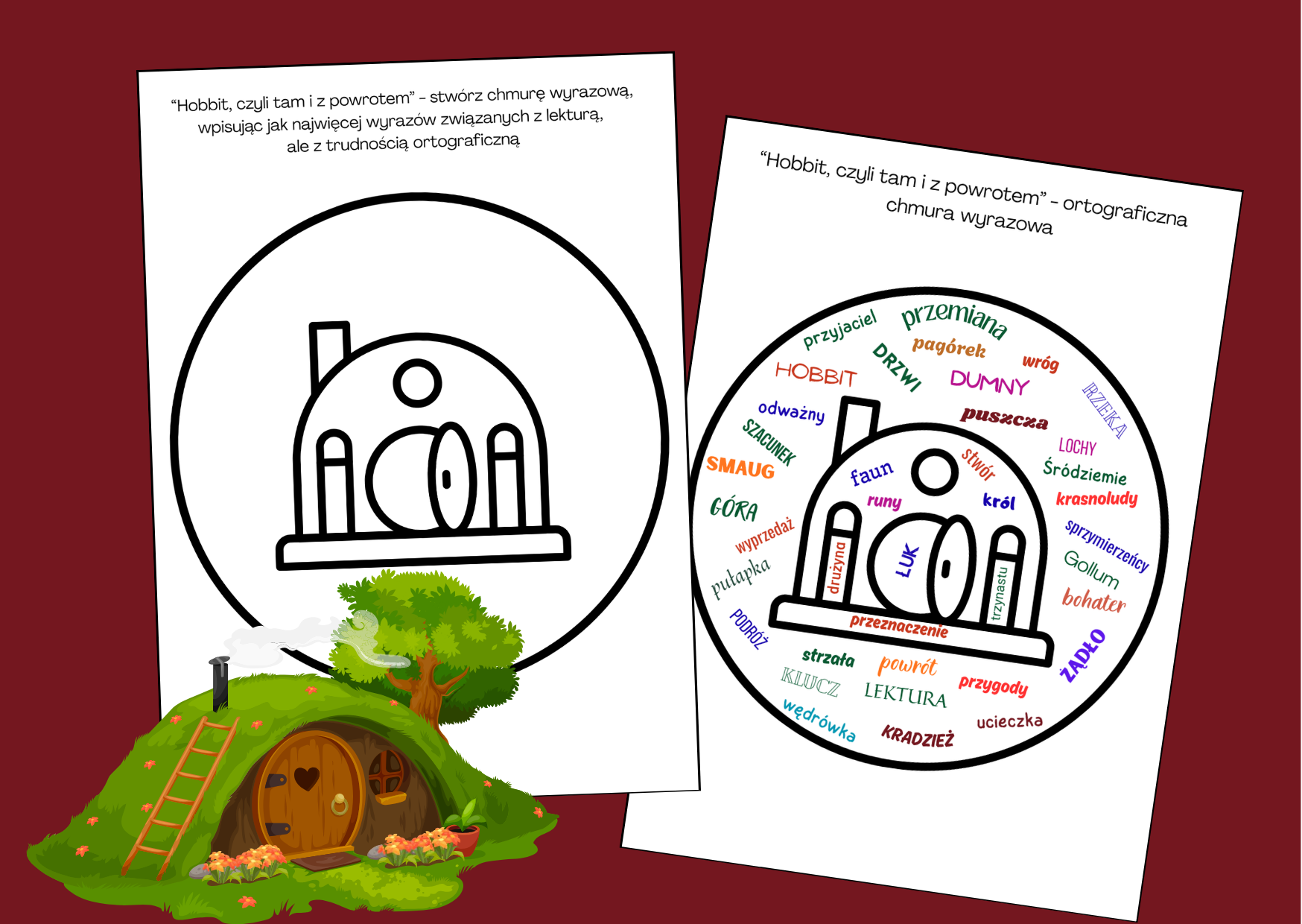 Na pierwszej karcie znajduje się kolorowa chmura wyrazowa w kształcie charakterystycznego domku Hobbita. Wpisano w nią wyrazy z trudnością ortograficzną, nawiązujące do treści książki,