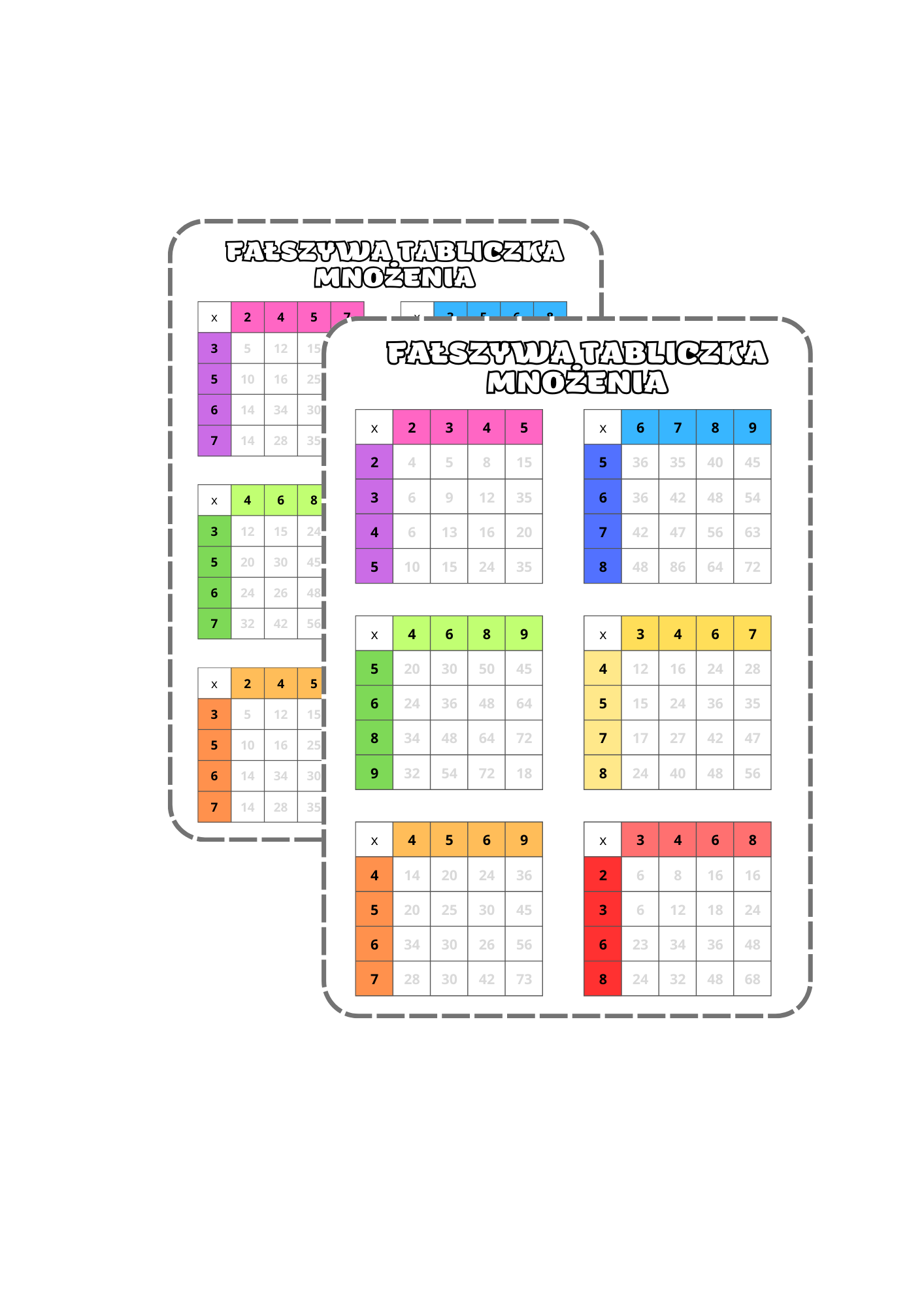 Karta pracy zawiera 2 strony po 6 “tabliczek mnożenia”. Zadaniem uczniów jest wychwycić błędy i je poprawić. Zadanie uczy spostrzegawczości, skrupulatności oraz ćwiczy nawyk sprawdzania poprawności rozwiązania. Oczywiście trenuje tez tabliczkę mnożenia:)
