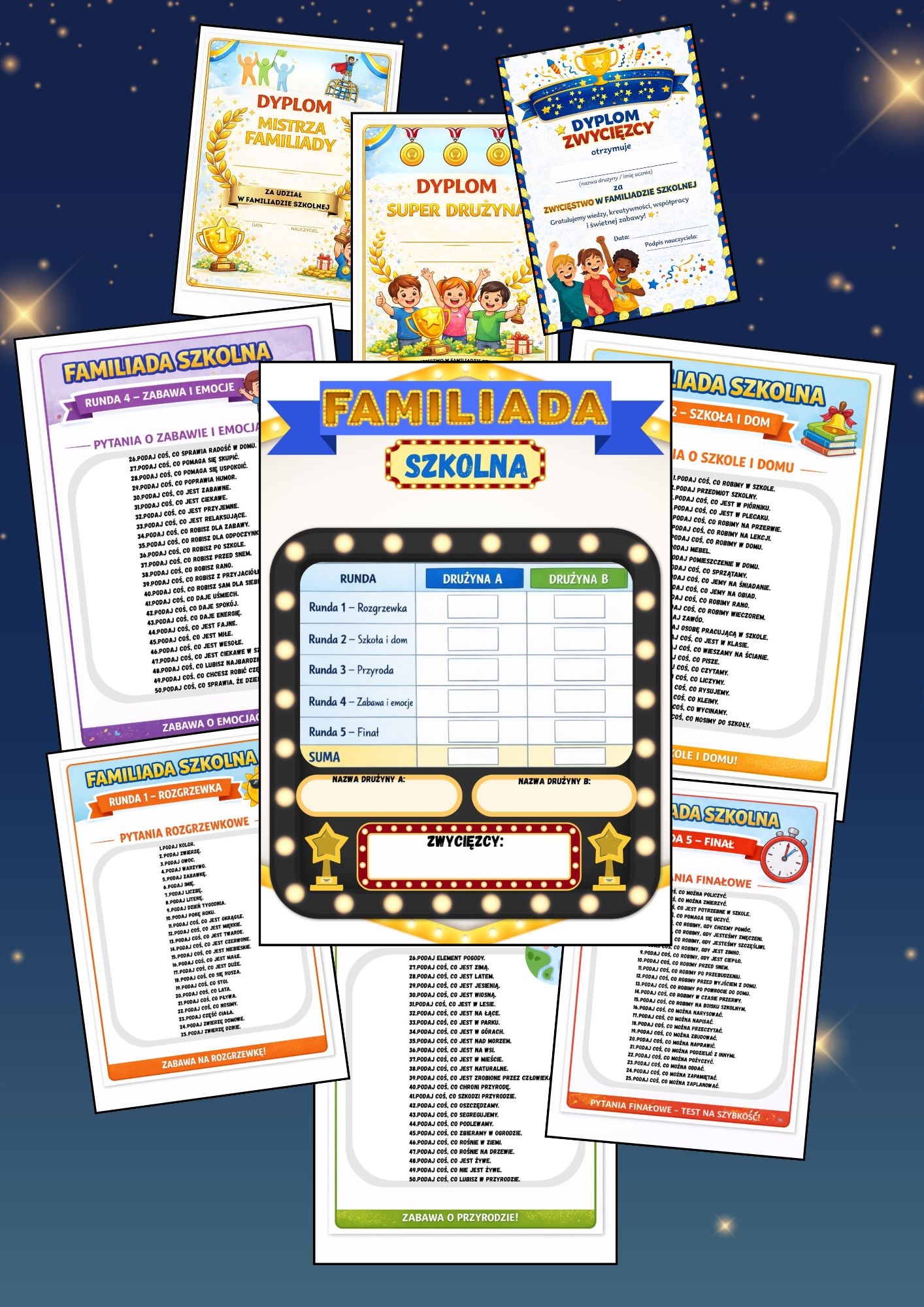 Familiada Szkolna to kompletna, gotowa do użycia gra, która zamienia zwykłą lekcję w angażujący teleturniej dla całej klasy.