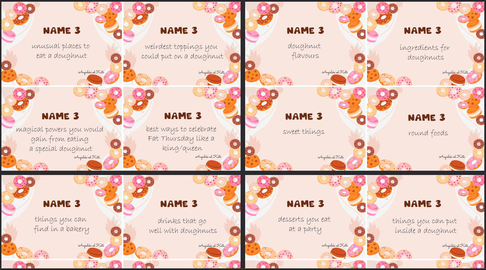 zawiera 32 hasła do ćwiczenia mówienia na lekcji języka angielkiego w miły i zabawny sposób o tematyce Tłustego Czwartku. Plik zawiera rózniweż tło. Zagadnienia od A1- B2.