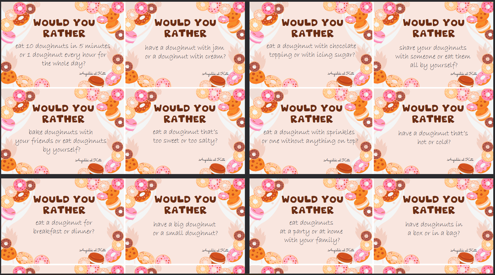 to zestaw 40 zabawnych pytań ćwiczacych mówienie na zajęciach z języka angielskiego związane z Tłustym Czwartkiem. Zawiera również tło. Poziom A1-B2.