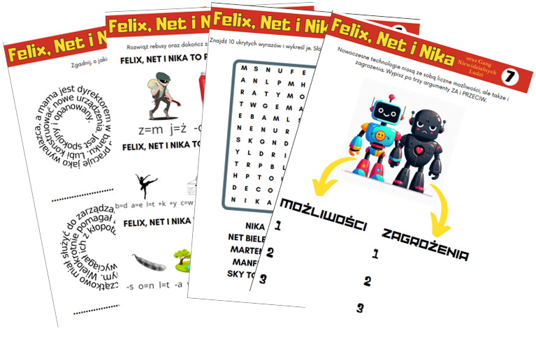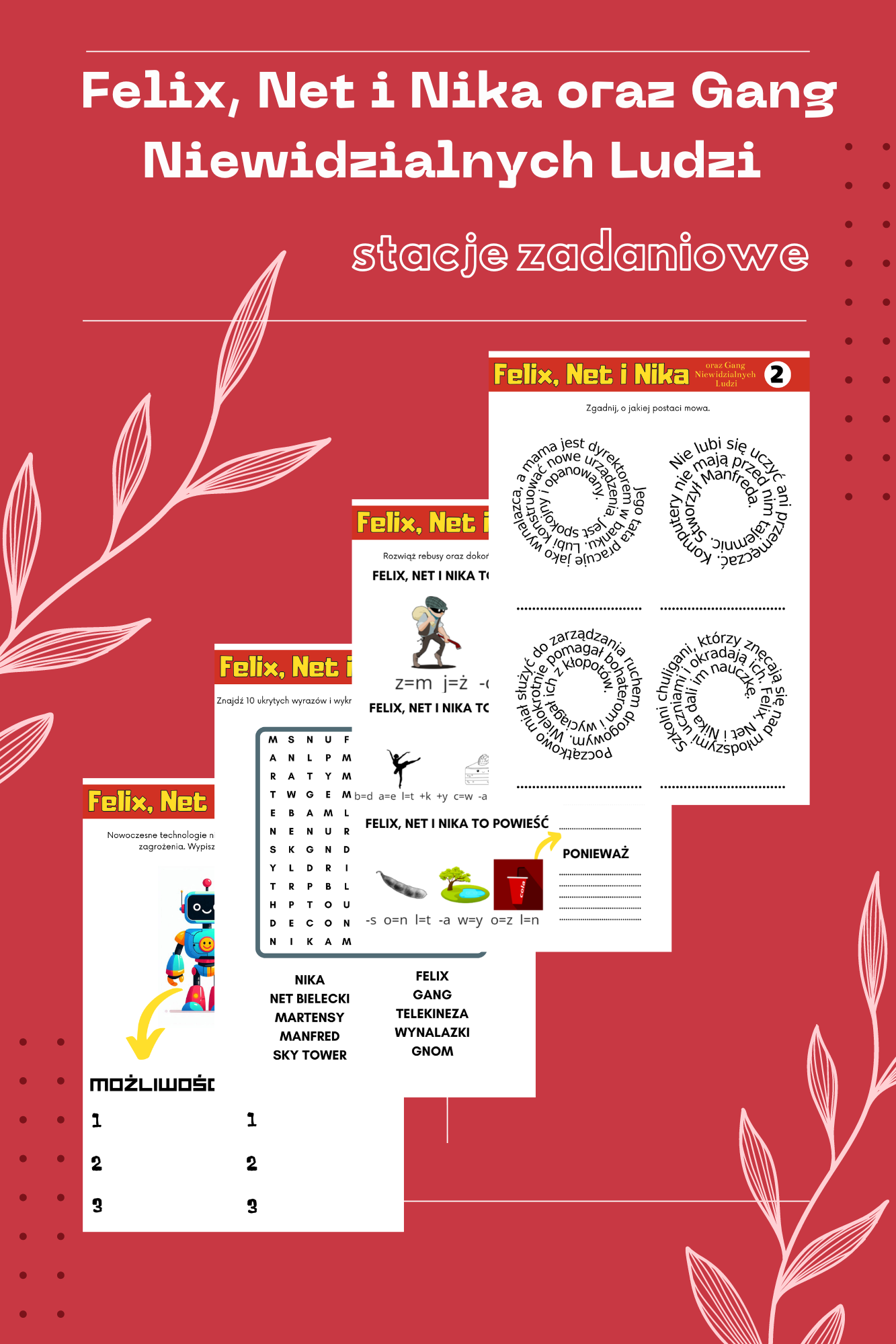 Zestaw zawiera osiem kart z różnymi stacjami zadaniowymi z lektury „Felix, Net i Nika oraz Gang Niewidzialnych Ludzi”.