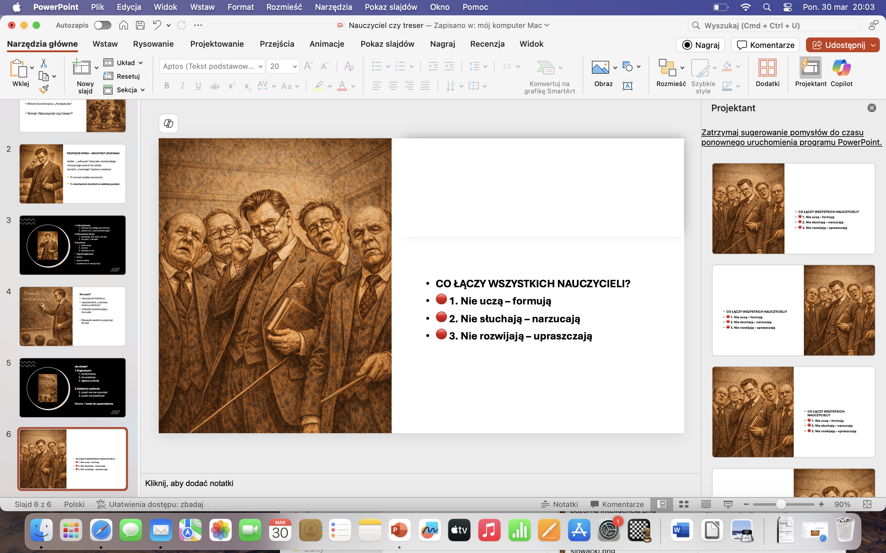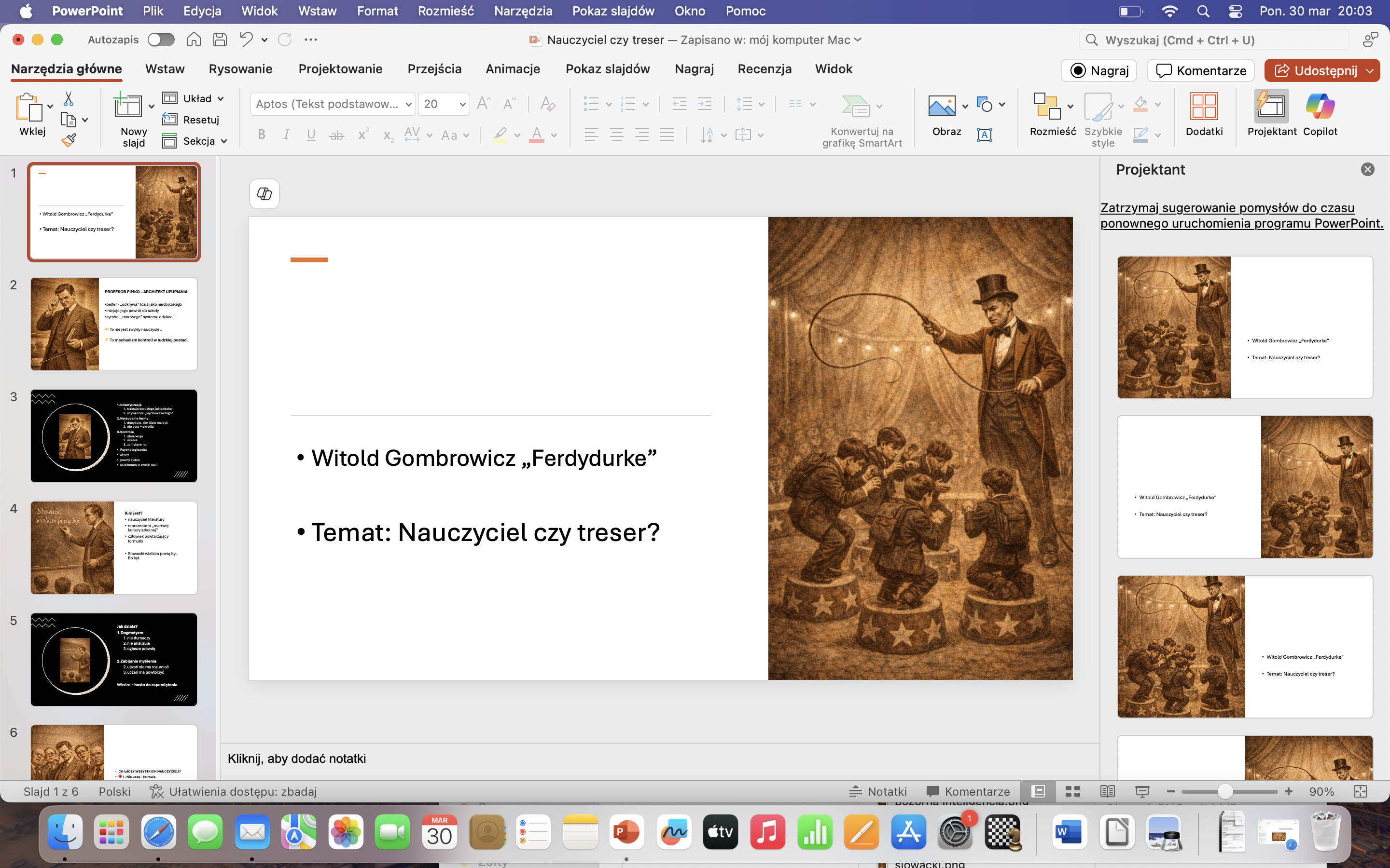 Prezentacja podkreśla, że nauczyciel w świecie Gombrowicza staje się raczej „treserem” niż przewodnikiem, a szkoła – miejscem ograniczającym samodzielne myślenie.