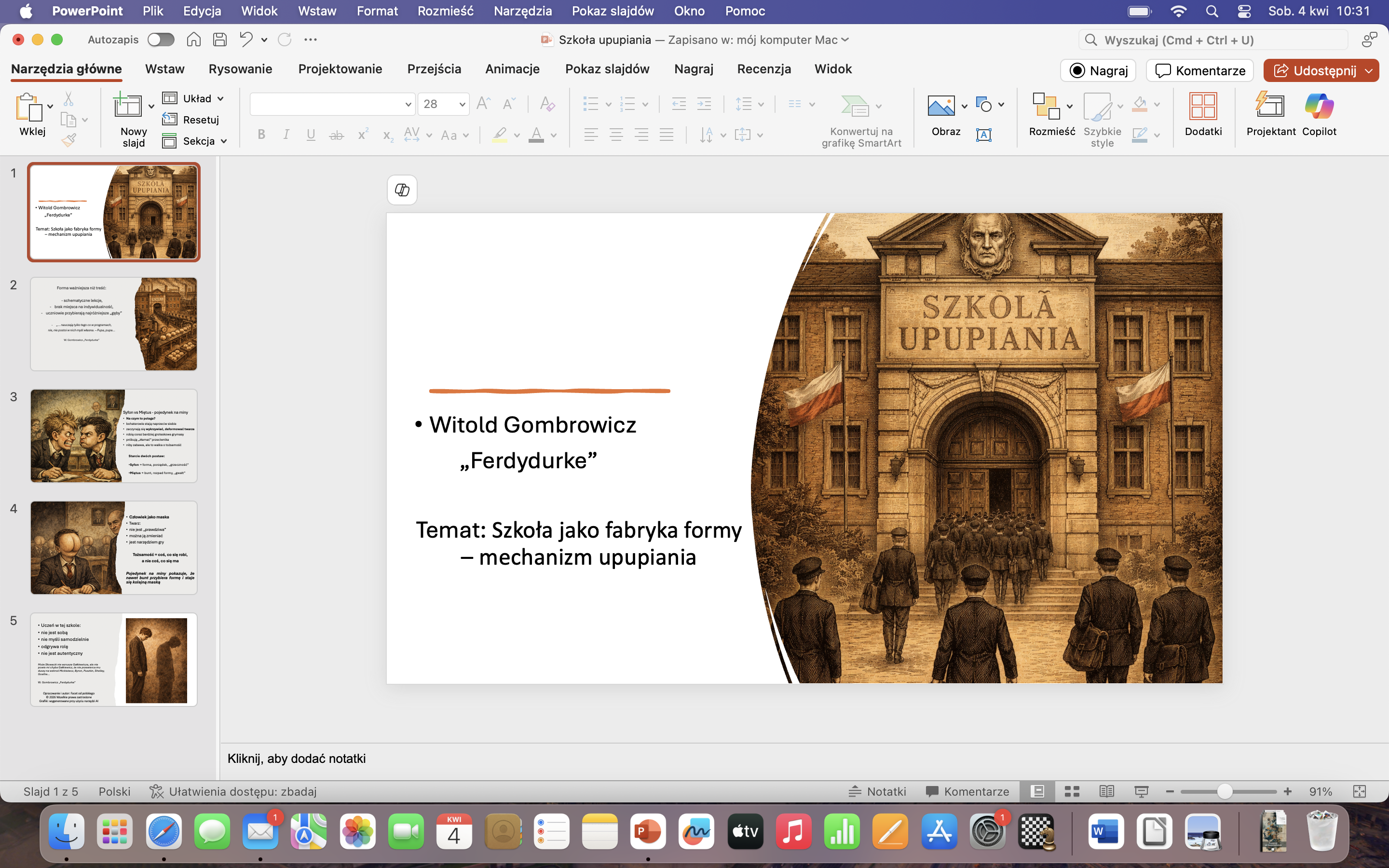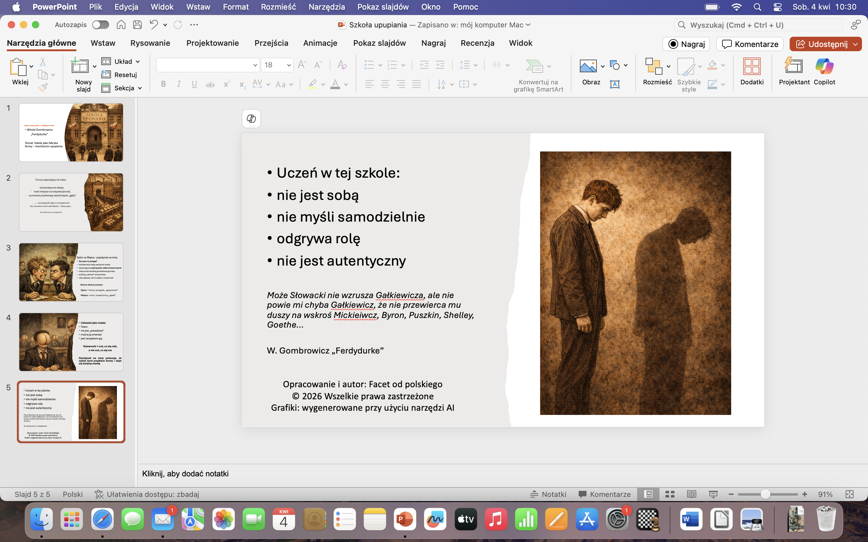 W przystępny sposób przedstawia mechanizmy funkcjonowania szkoły, w której forma staje się ważniejsza niż indywidualność i samodzielne myślenie. Prezentacja omawia także symboliczny pojedynek Syfona i Miętusa jako starcie porządku z buntem.
