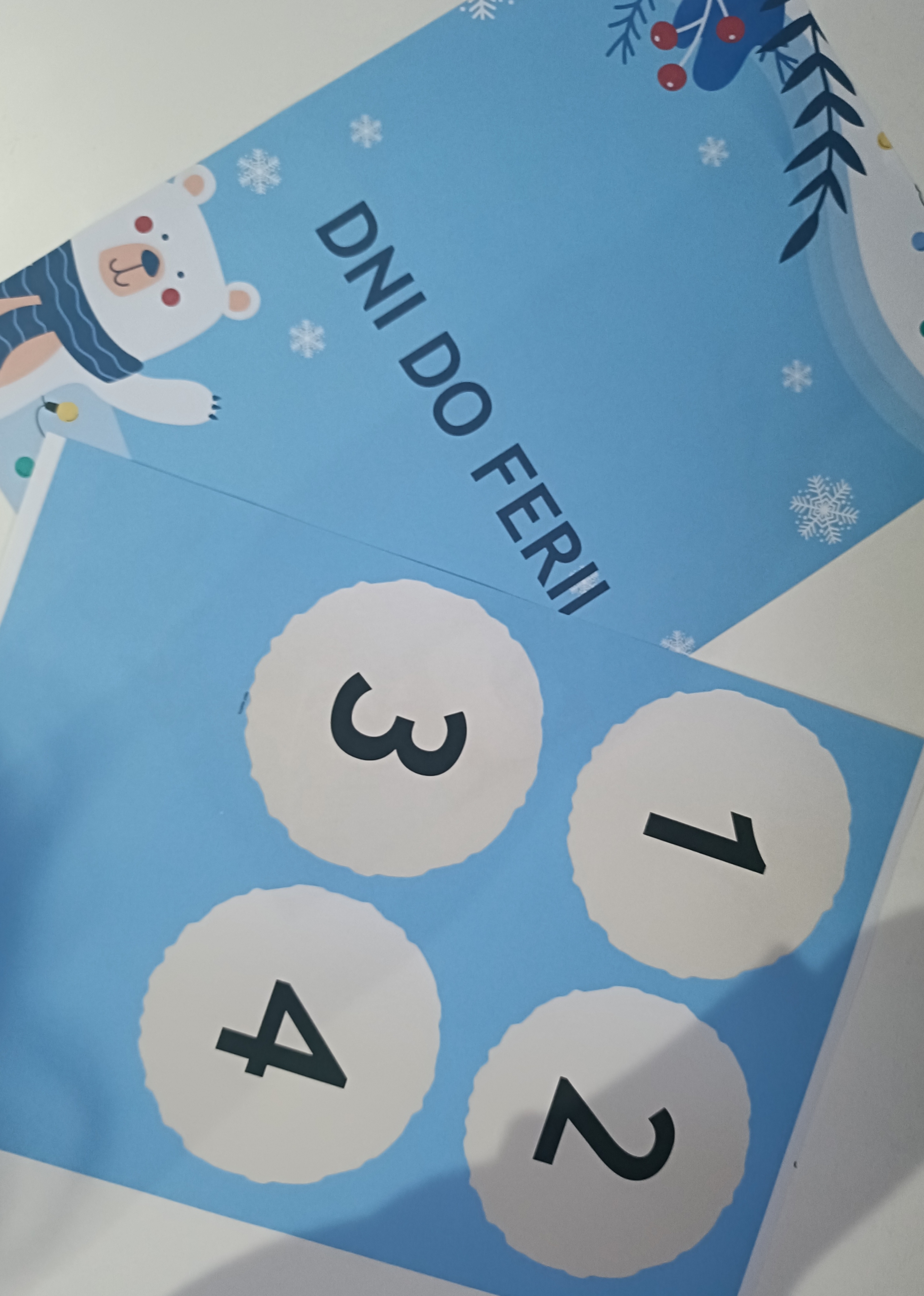 Plakat a4 z informacją ile dni zostało do ferii, liczba dni znajduje się na kulach śnieżnych od 1 do 30.