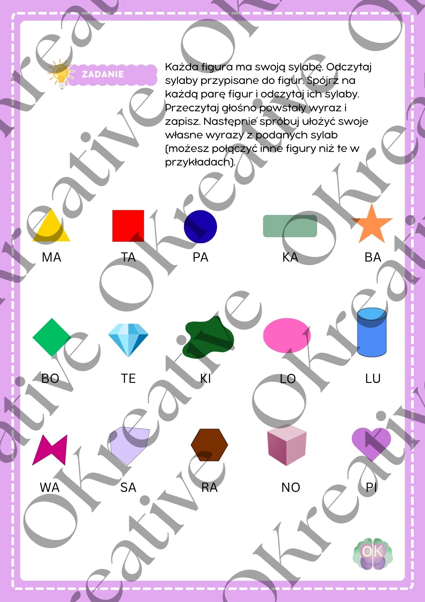 Sylabowe figury to karta pracy, która w ciekawy i angażujący sposób pomaga dzieciom ćwiczyć czytanie, analizę i syntezę sylabową. Ćwiczenie łączy elementy językowe i matematyczne, rozwijając jednocześnie spostrzegawczość, koncentrację i kreatywność.