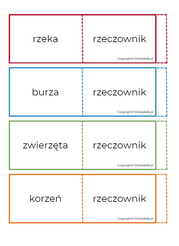 Aby przygotować dwustronne fiszki, należy zgiąć wycięte elementy na pół – w miejscu przerywanej linii, a z drugiej strony zabezpieczyć zakładką, również oznaczoną linią przerywaną. Tak przygotowane karty są gotowe do nauki.