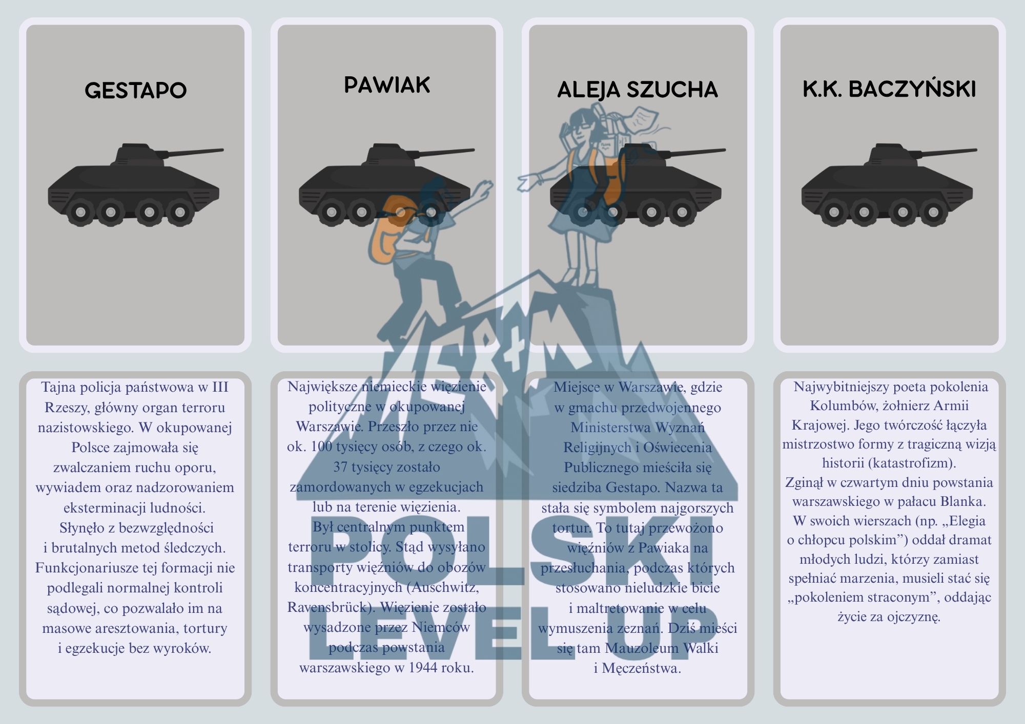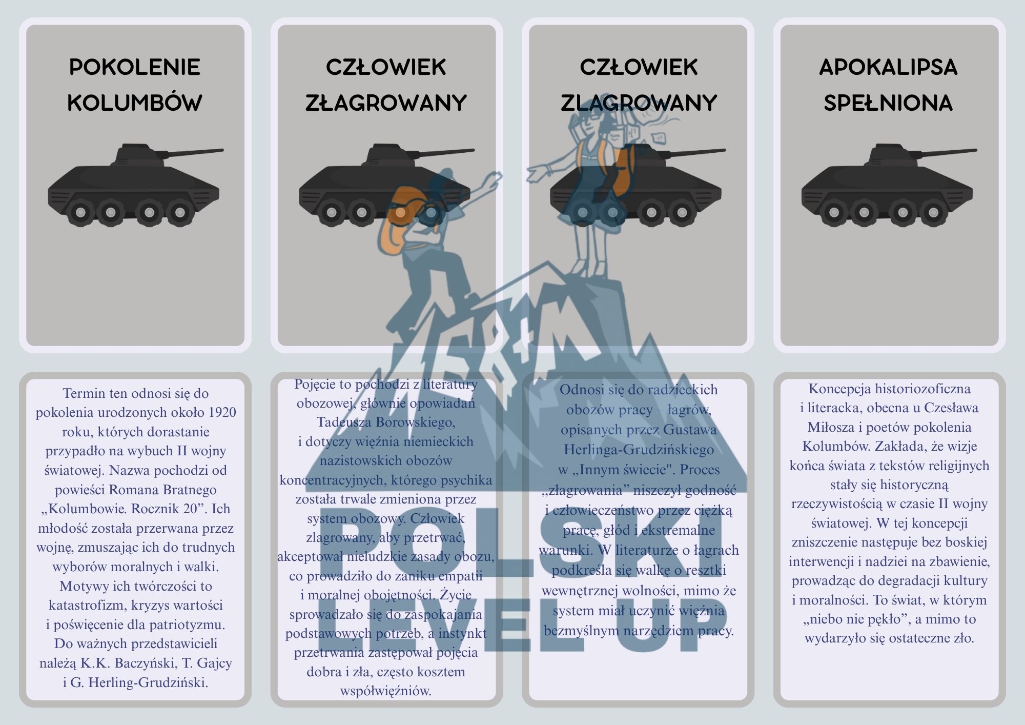 Materiał powstał na prośbę moich uczniów. Przed Wami fiszki literackie poświęcone okresowi wojny i okupacji. To zbiór 40 terminów wraz z definicjami. Fiszki możecie pociąć i wtedy posłużą do zabawy podczas zajęć, np. w parach. Najlepiej sprawdzi się ta metoda podczas zajęć powtórzeniowych. Pomoc może być też wykorzystywana w domowym zaciszu. Wystarczy zagiąć kafelki i ćwiczyć znajomość słownictwa przydatnego na maturze.