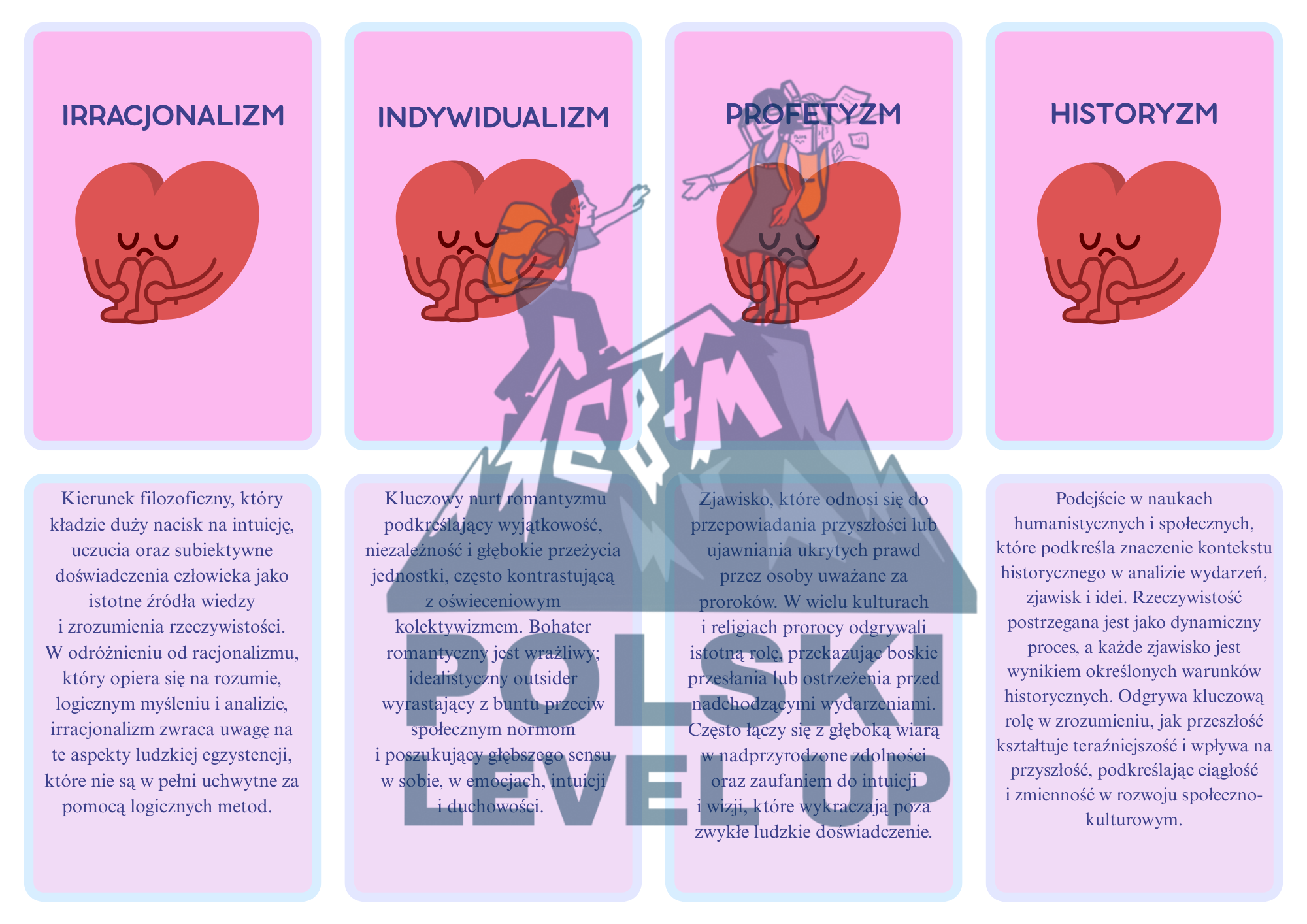 1. Materiał powstał na prośbę moich uczniów. Przed Wami fiszki literackie poświęcone romantyzmowi. To zbiór 52 terminów wraz z definicjami. Fiszki możecie pociąć i wtedy posłużą do zabawy podczas zajęć, np. w parach. Najlepiej sprawdzi się ta metoda podczas zajęć powtórzeniowych. Pomoc może być też wykorzystywana w domowym zaciszu. Wystarczy zagiąć kafelki i ćwiczyć znajomość słownictwa przydatnego na maturze.