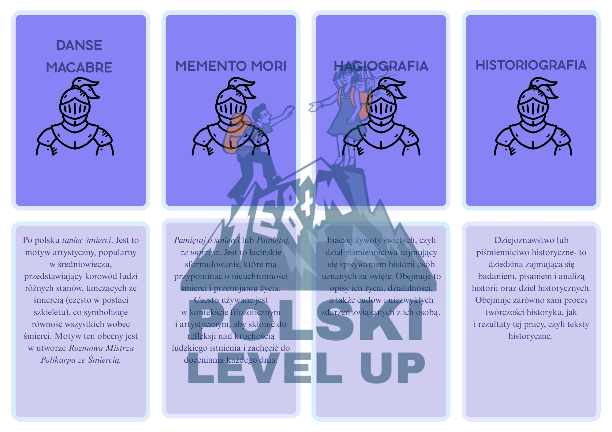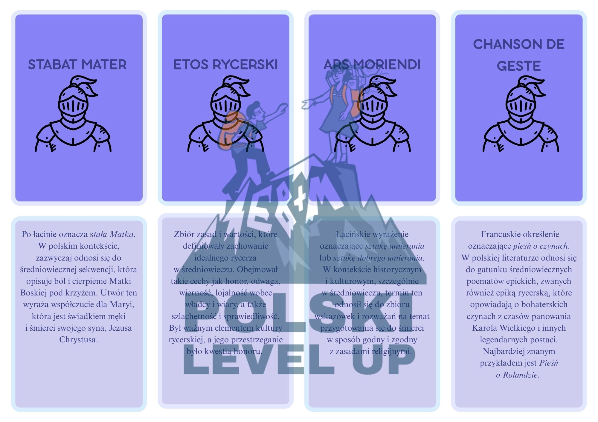 Materiał powstał na prośbę moich uczniów. Przed Wami fiszki literackie poświęcone średniowieczu. To zbiór 56 terminów wraz z definicjami. Fiszki możecie pociąć i wtedy posłużą do zabawy podczas zajęć, np. w parach. Najlepiej sprawdzi się ta metoda podczas zajęć powtórzeniowych. Pomoc może być też wykorzystywana w domowym zaciszu. Wystarczy zagiąć kafelki i ćwiczyć znajomość słownictwa przydatnego na maturze.