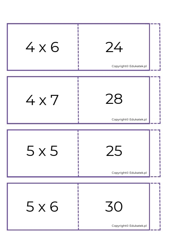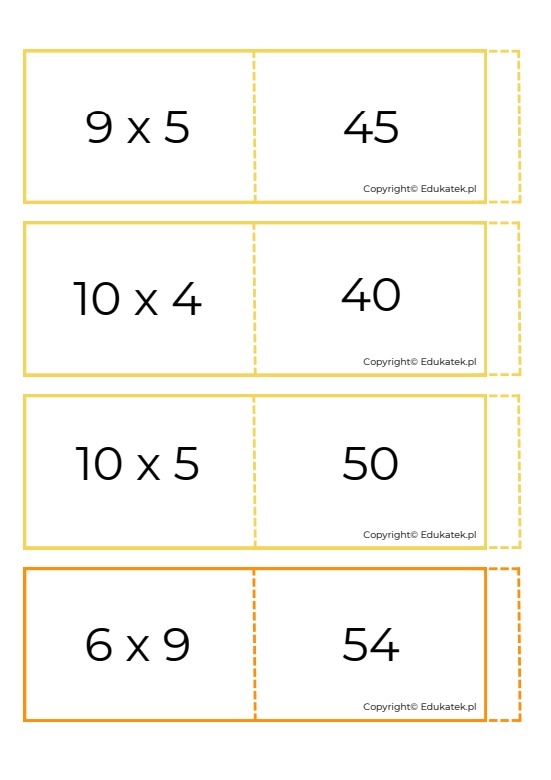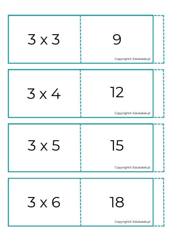 Fiszki – tabliczka mnożenia to zestaw elementów umożliwiający doskonalenie mnożenia. Karty są w 4 różnych kolorach. Każdy z nich odpowiada innemu poziomowi trudności (niebieski – zakres do 20; fioletowy – zakres do 30; żółty – zakres do 50; pomarańczowy – zakres do 100). Zestaw liczy 22 strony do samodzielnego wydrukowania. Łącznie znajduje się w nim 86 fiszek. Zabawa ma bardzo dużo możliwości wykorzystania podczas zajęć.
