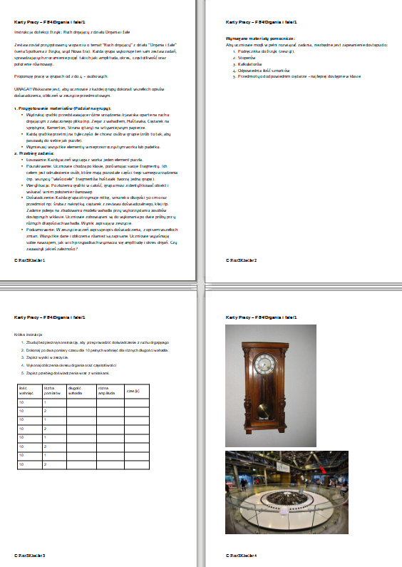 Innowacyjny podział na grupy: Instrukcja przygotowania "puzzli" z grafikami urządzeń wykonujących ruch drgający (np. zegar z wahadłem, huśtawka, kamerton), co służy jako dynamiczny wstęp do lekcji i integracja zespołu.