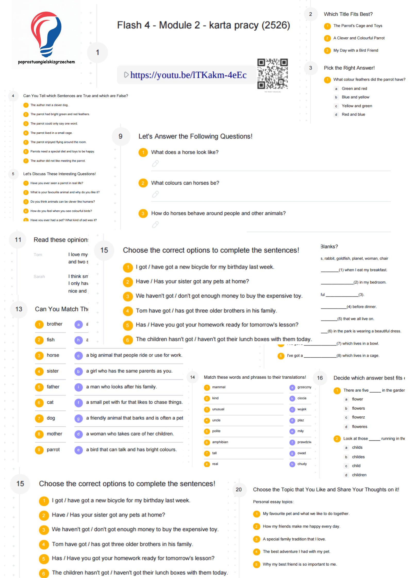 20 zadań zostało opracowanych na podstawie działu drugiego z podręcznika Flash 4. Słownictwo z tego działu w postaci testów możesz znaleźć tutaj. Niniejszą kartę pracy możesz wykorzystać do przeprowadzenia całej lekcji w zakresie słuchania, czytania, konwersacji, słownictwa oraz pisania. Możesz też podzielić lekcję na ćwiczenie każdej z tych umiejętności z osobna, gdyż każde zadanie zostało umieszczone na osobnej stronie.