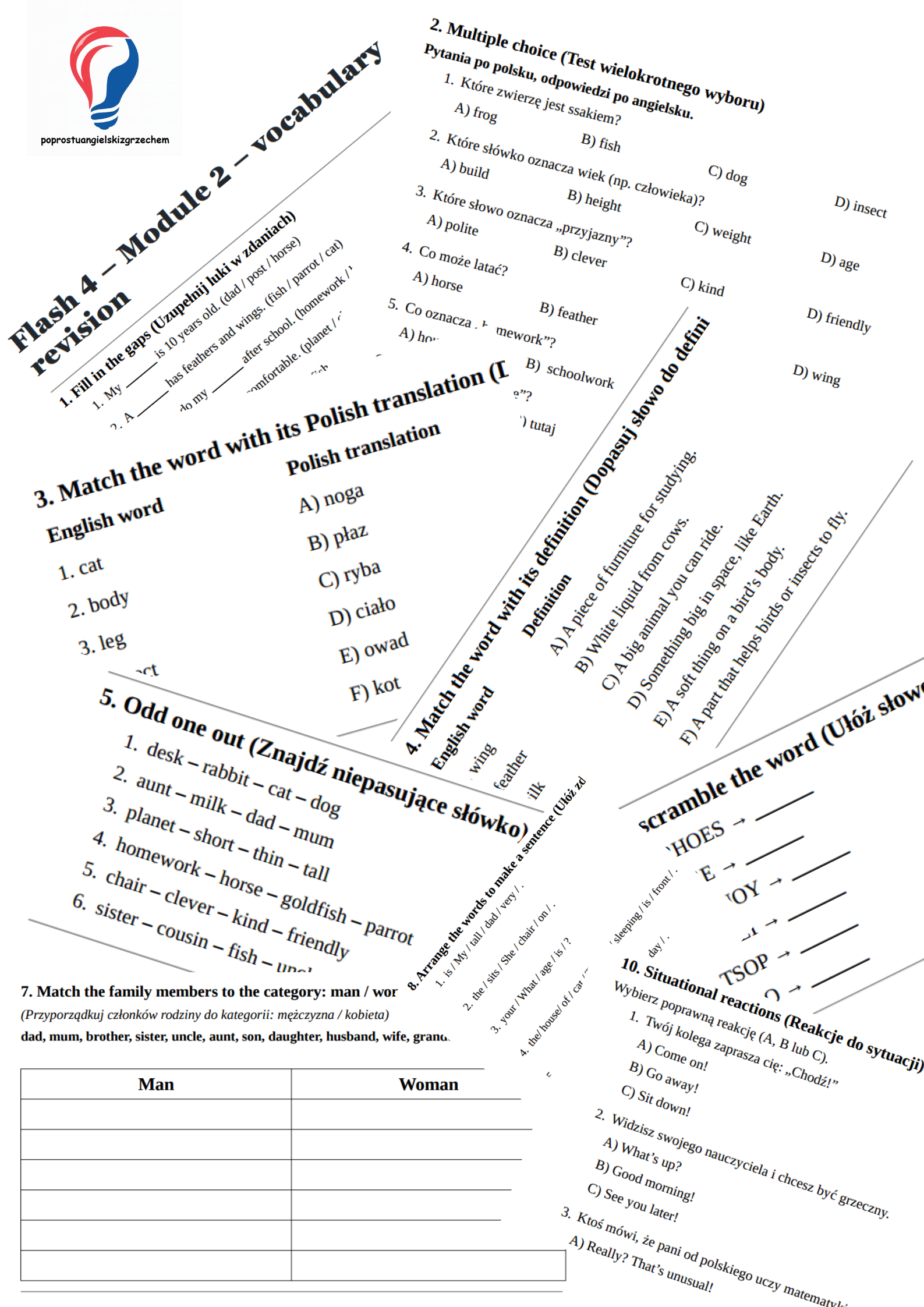 Dziesięć zadań na słownictwo do działu drugiego z podręcznika Flash 4. Słownictwo z działu drugiego w postaci karty pracy tutaj, a w postaci testów tutaj. Niniejsze zadania możesz wykorzystać do przeprowadzenia powtórki, kartkówki lub do utrwalenia materiału ze słownictwa.