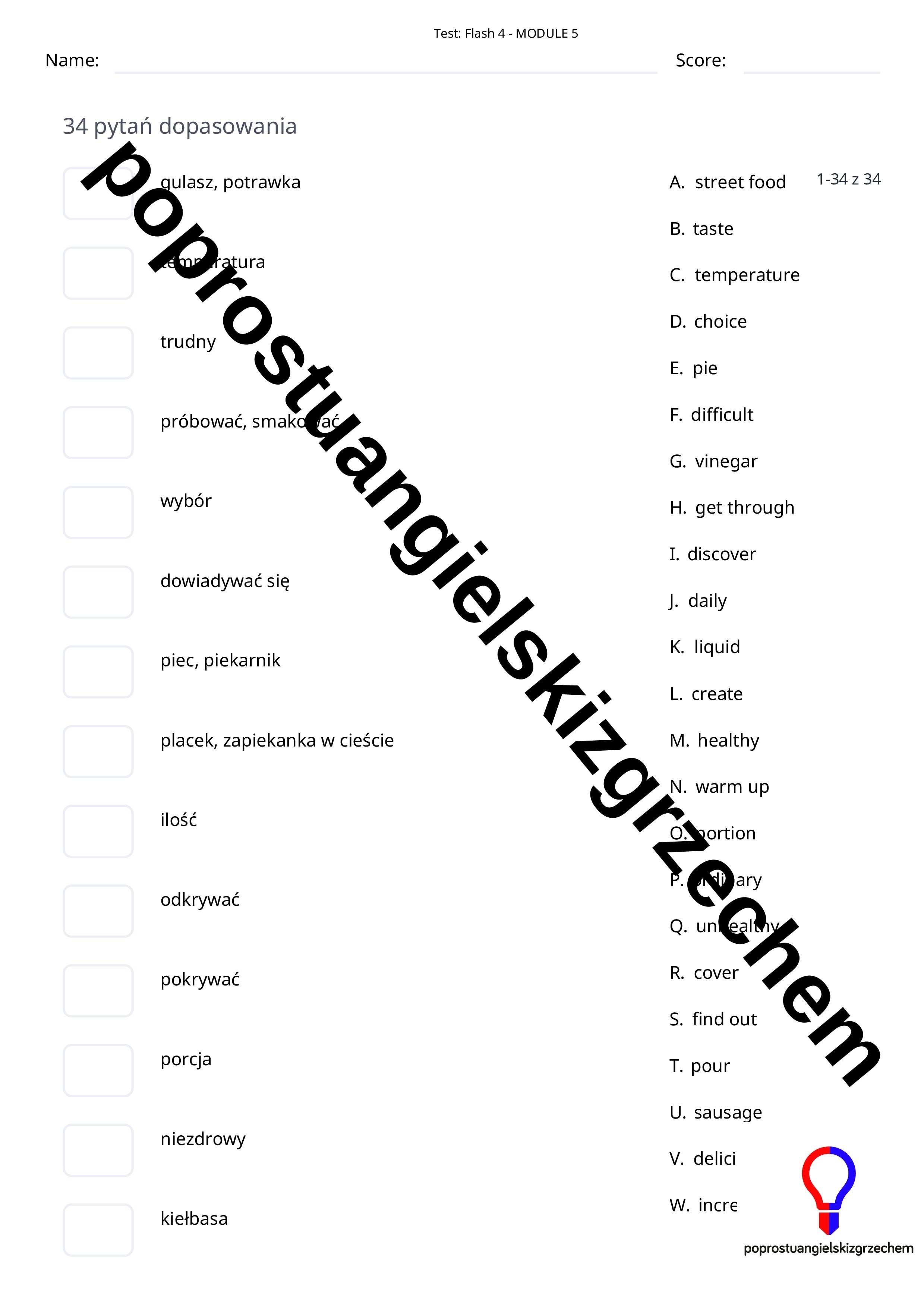 Zestaw zawiera 78 słówek z działu piątego do podręcznika Flash 4. Testy podzielone są na 3 podrozdziały, a każdy z nich na 4 kategorie zadań (prawda/fałsz, dopasuj, wielokrotny wybór, pisemny)