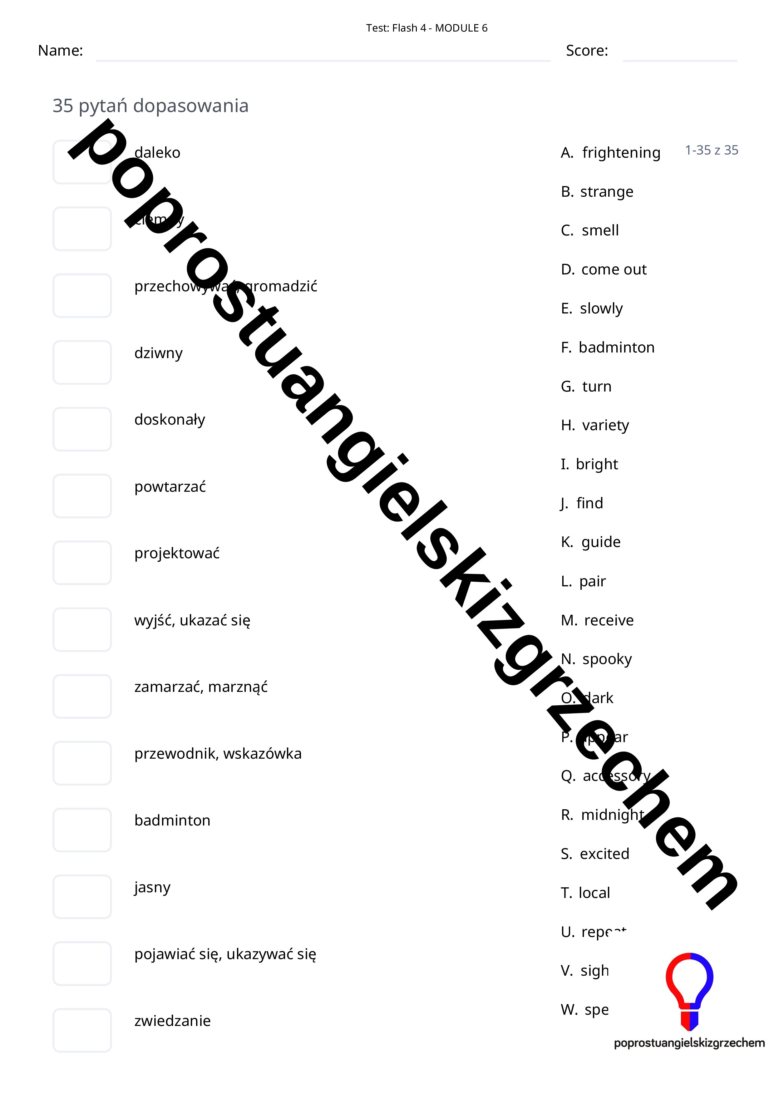 Zestaw zawiera 75 słówek z działu szóstego do podręcznika Flash 4. Testy podzielone są na 4 podrozdziały, a każdy z nich na 4 kategorie zadań (prawda/fałsz, dopasuj, wielokrotny wybór, pisemny)