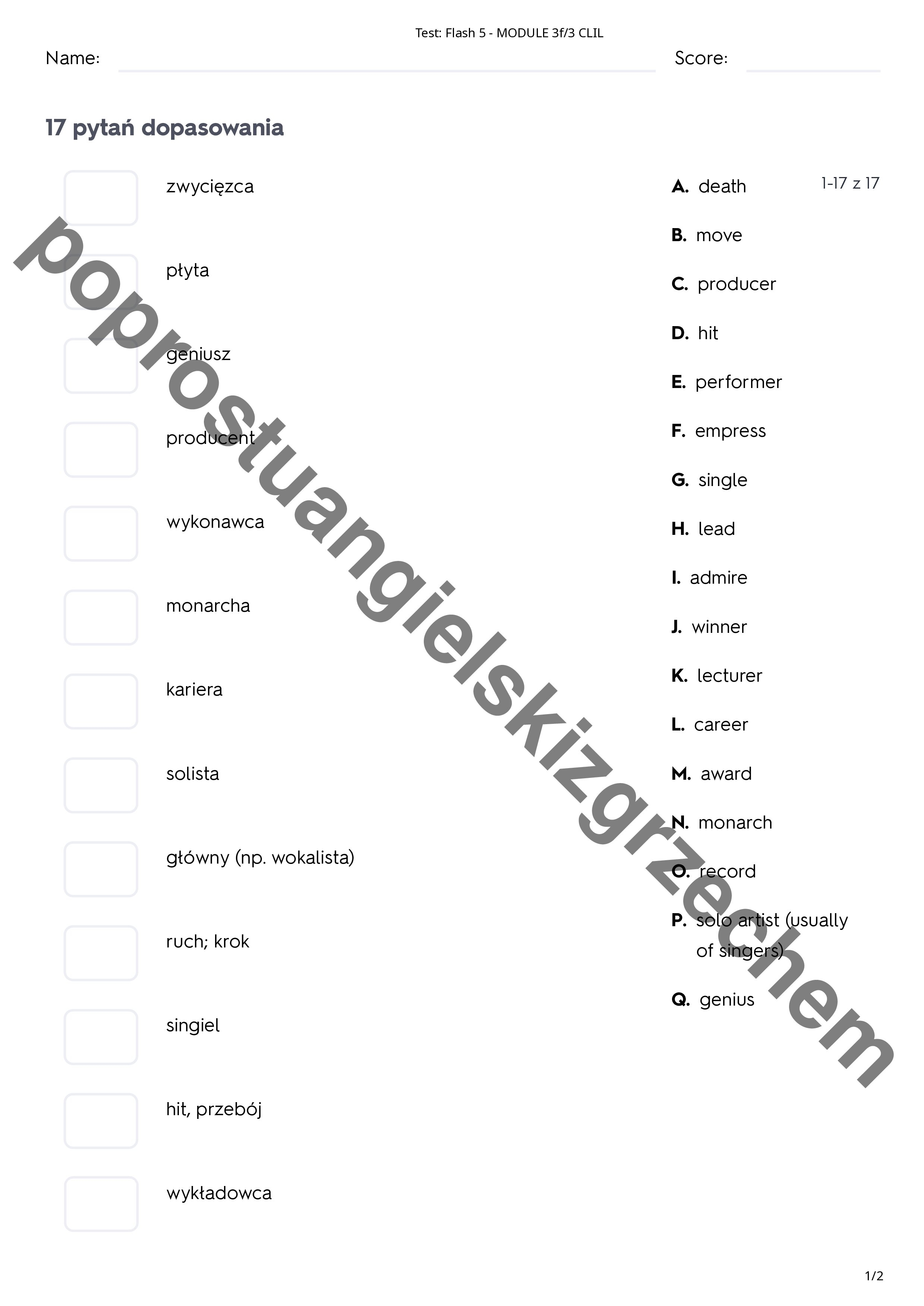 Zestaw zawiera 51 słówek z działu trzeciego do podręcznika Flash 5. Testy podzielone są na 4 podrozdziały, a każdy z nich na 4 kategorie zadań (prawda/fałsz, dopasuj, wielokrotny wybór, pisemny)