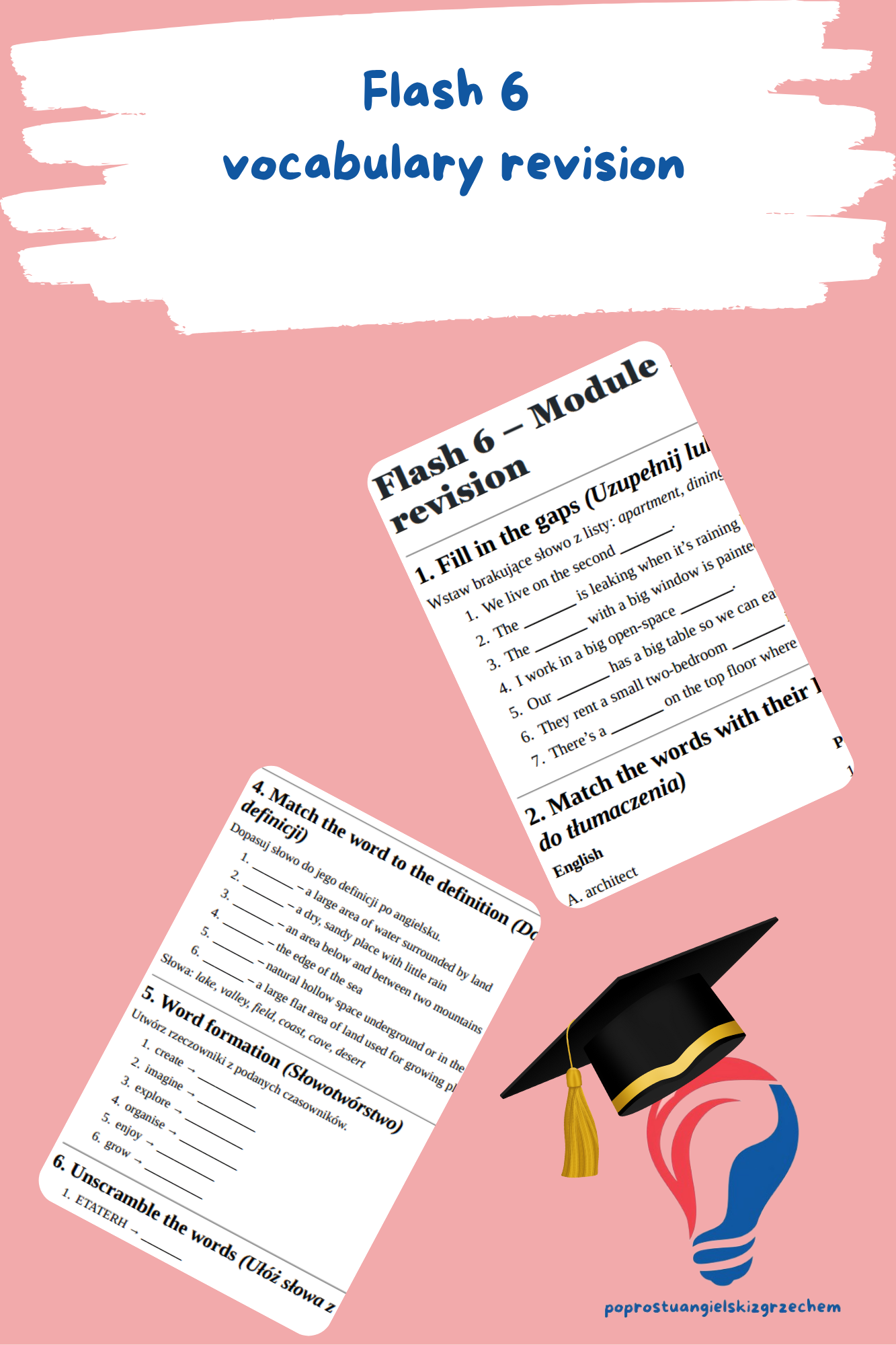 Dziesięć zadań na słownictwo do działu pierwszego z podręcznika Flash 6. Słownictwo z działu pierwszego w postaci testów tutaj, a w postaci krzyżówek tutaj. Niniejsze zadania możesz wykorzystać do przeprowadzenia powtórki, kartkówki lub do utrwalenia materiału ze słownictwa.