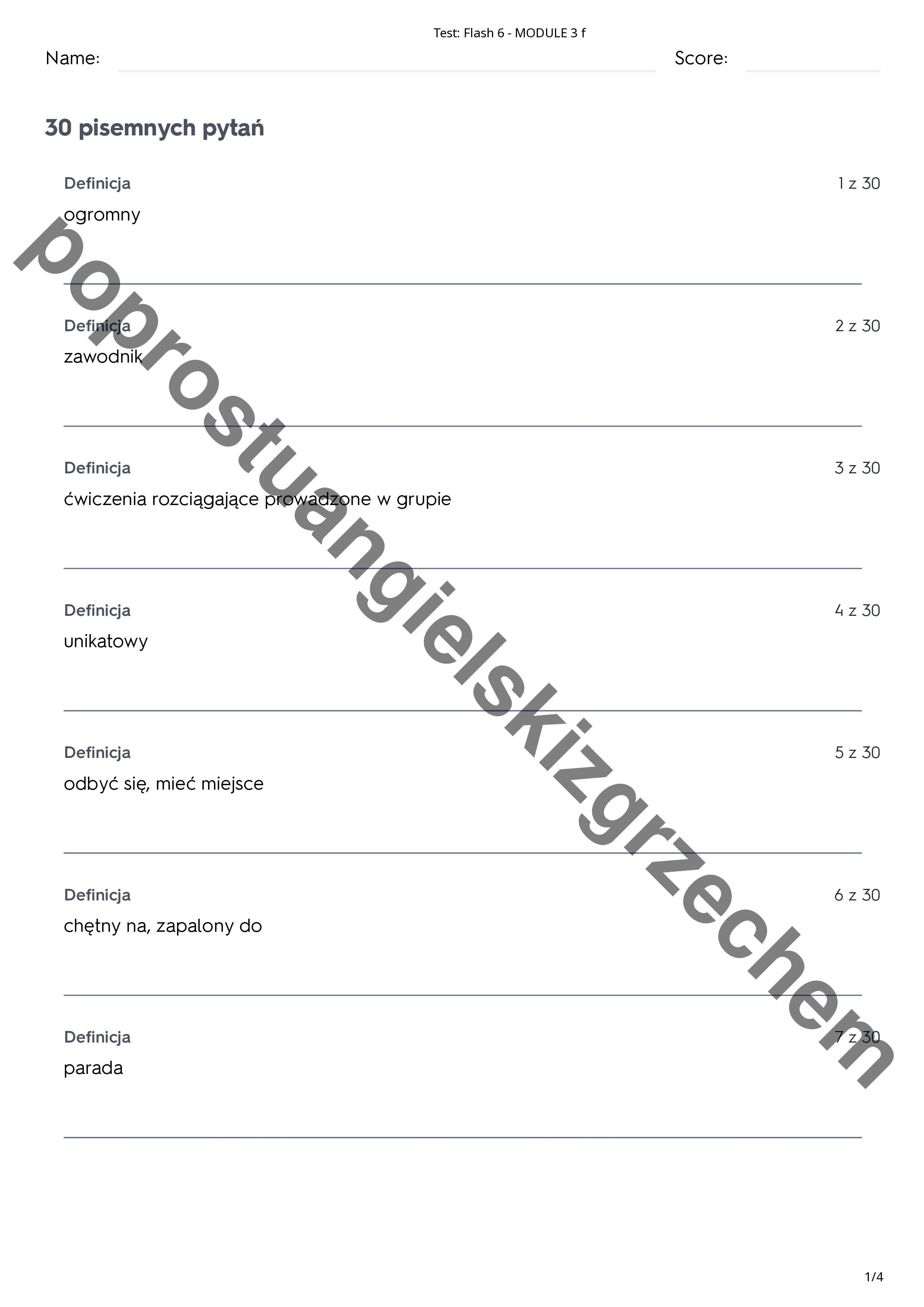 Zestaw zawiera 123 słówka z działu trzeciego do podręcznika Flash 6. Testy podzielone są na 5 podrozdziały, a każdy z nich na 4 kategorie zadań (prawda/fałsz, dopasuj, wielokrotny wybór, pisemny)
