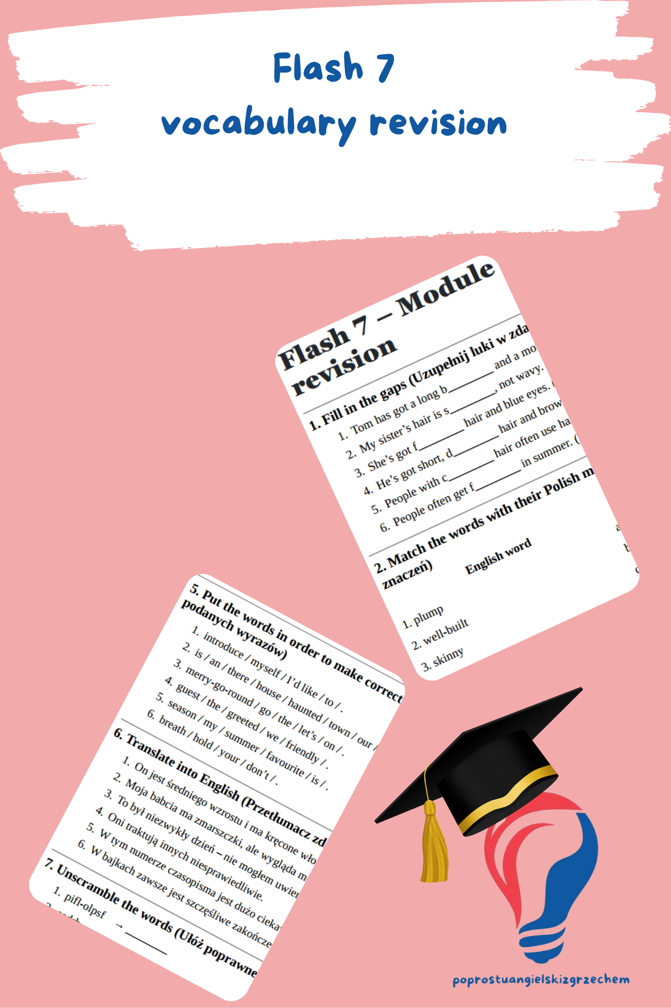 Dziesięć zadań na słownictwo do działu pierwszego z podręcznika Flash 7. Słownictwo z działu pierwszego w postaci karty pracy tutaj, w postaci testów tutaj, a w postaci krzyżówek tutaj. Niniejsze zadania możesz wykorzystać do przeprowadzenia powtórki, kartkówki lub do utrwalenia materiału ze słownictwa.
